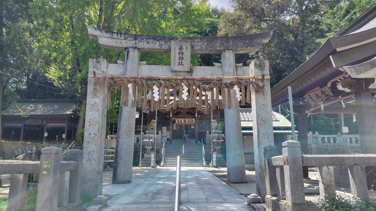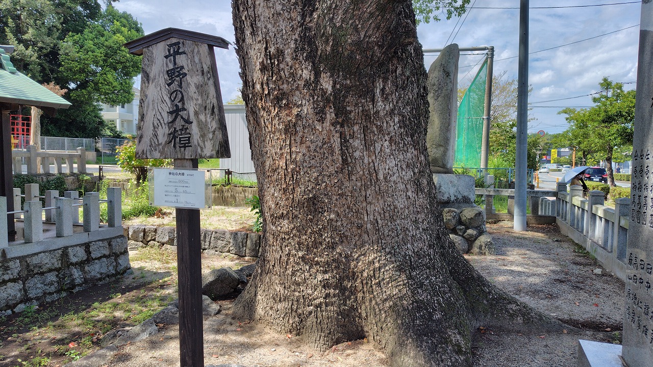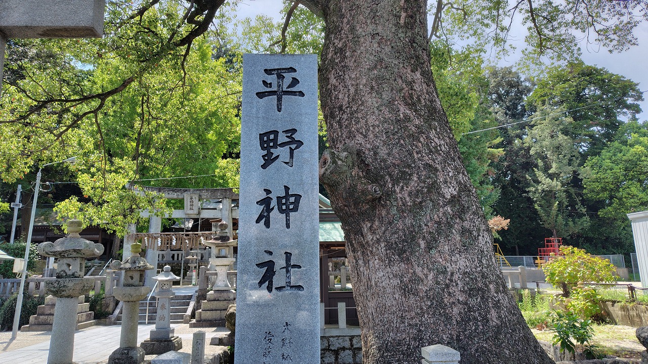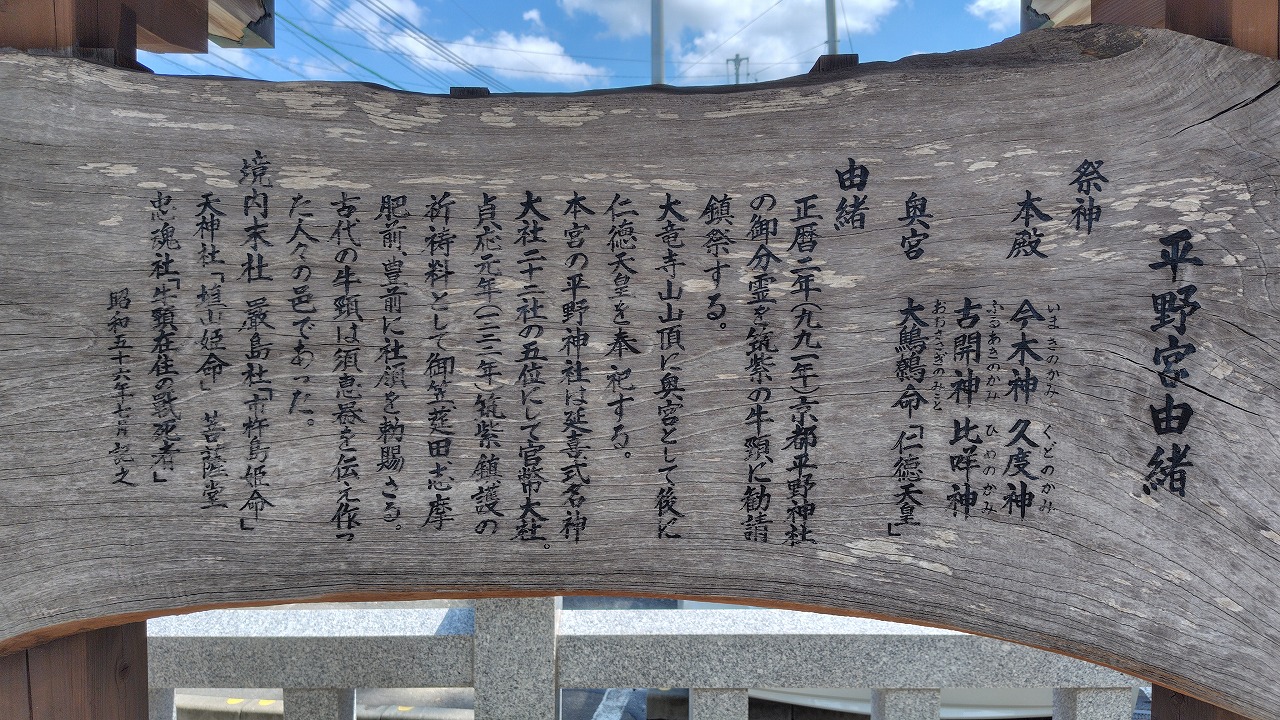伝承では正暦年中(990から994)に創建されたと伝わり、京都にある平野神社から勧請されました。平野神社には、今木神(いまきのかみ)、久度神(くどのかみ)、古開神(ふるあきのかみ)、比売神(ひめがみ)が祀られています。今木は古くから住んでいる人に対する新しく来た人、すなわち渡来系の神の意であり、久度は窯(かまど)の神(大野城市でもかまどのことをくどと言う)、古開は使い古した使用済みの窯の神であり、比売神はあとから合祀された桓武天皇の生母高野新笠と言われています。