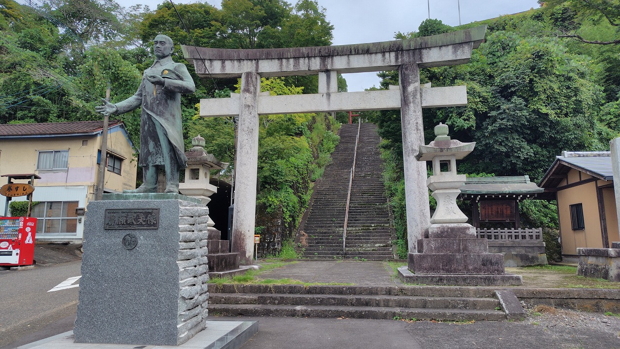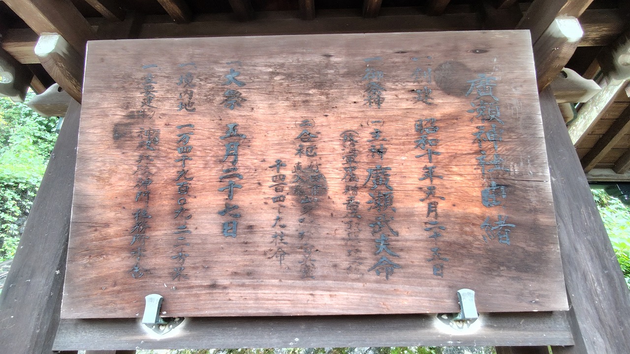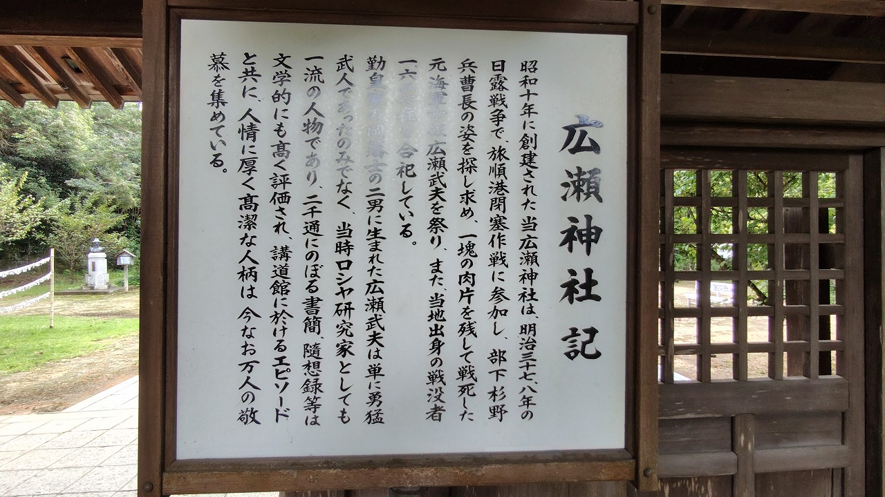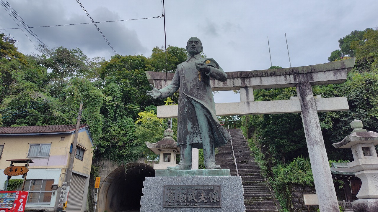 大分県竹田市に鎮座します。同市出身で「軍神」と呼ばれた海軍中佐の広瀬武夫命を御祭神とし、他の戦没者とともに祀られています。