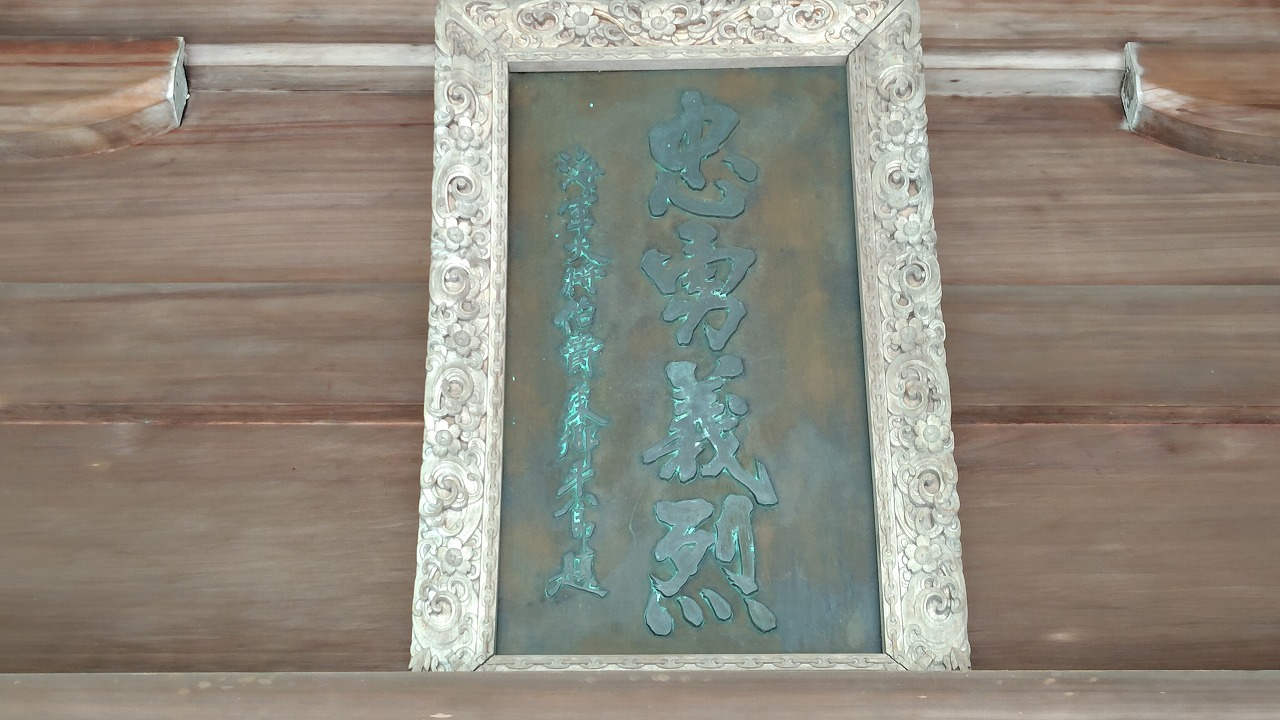 拝殿に掲げられた扁額。「忠勇義烈」とは、忠義に厚く、勇気があり、正義感が強いことのようです。