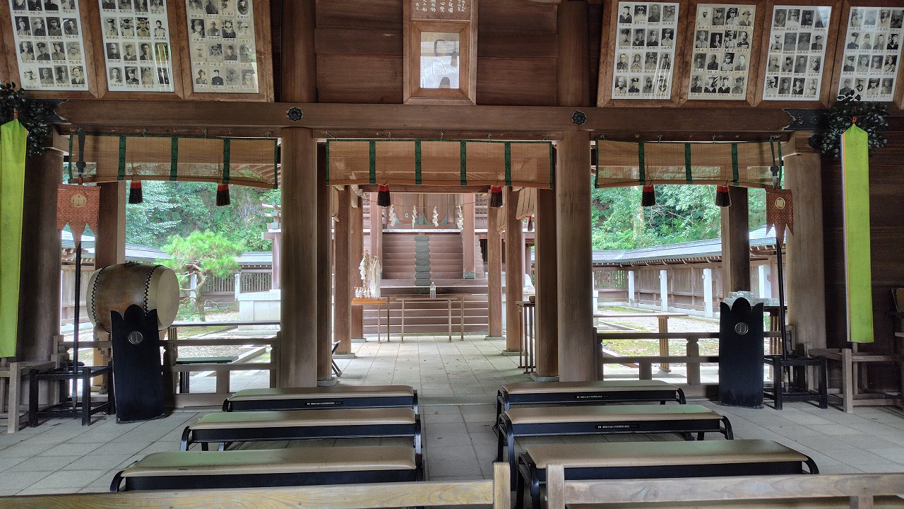 拝殿の中の様子。たくさん写真があるのは戦没者の方々かな…。