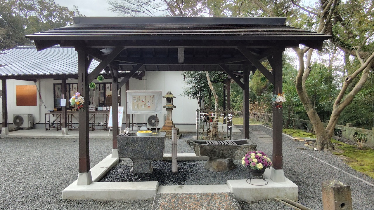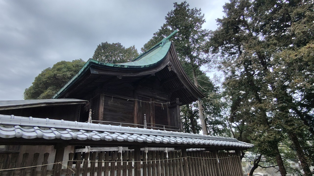 木造瓦葺きの拝殿。雨が降り、全体が漆黒でかっこいい!