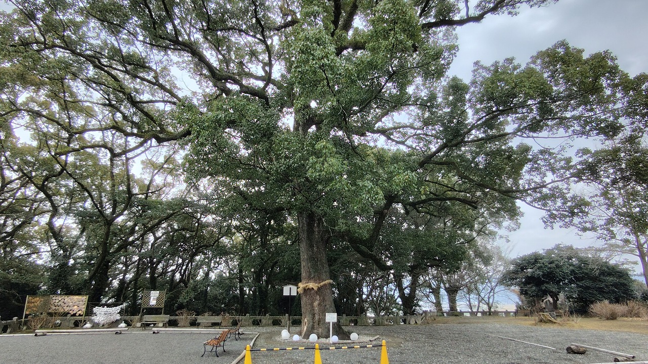 境内にそびえる大きな御神木。根元にはライトが置かれて夜はキレイかも。