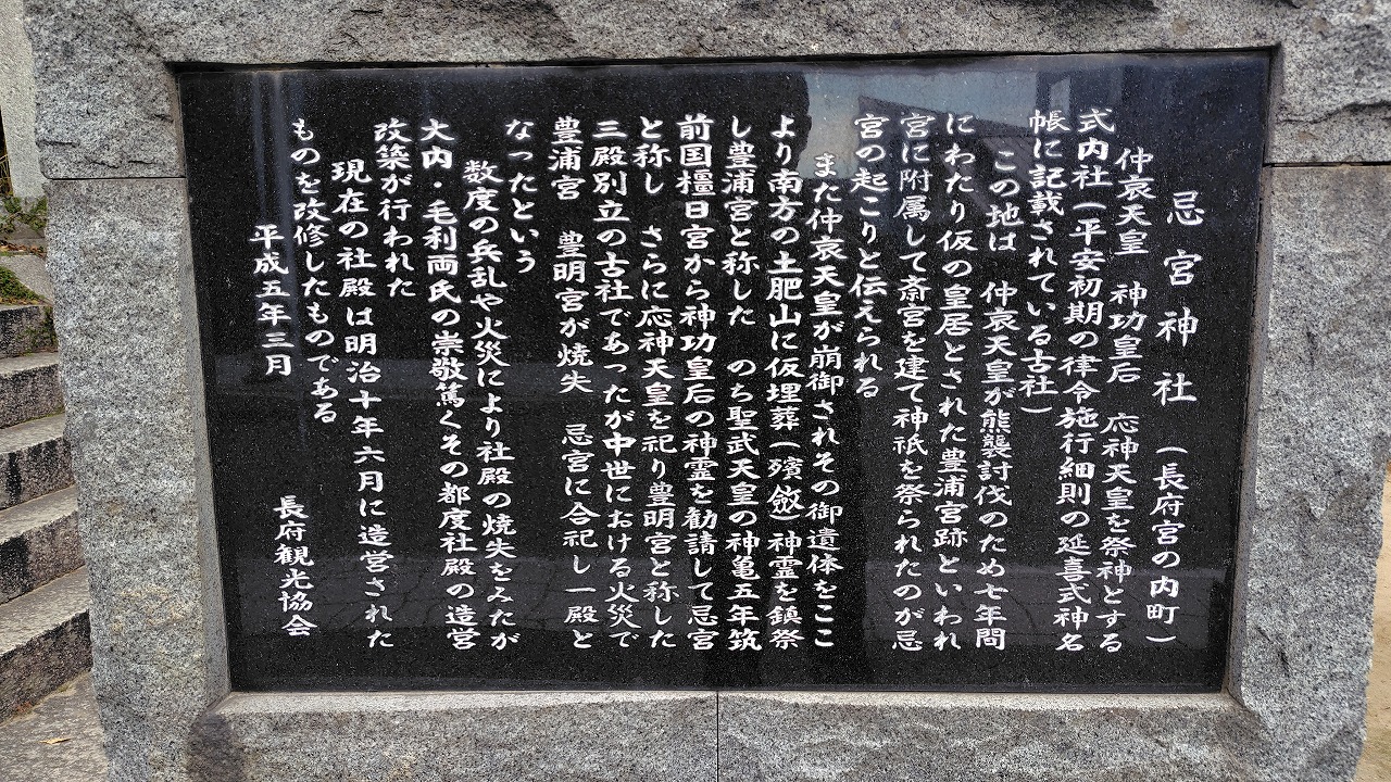 仲哀天皇・神功皇后が西国平定のために7年間にわたって皇居とされた「豊浦宮」の跡といわれている。また、仲哀天皇の遺体を土肥山で仮葬した際、神霊をを祀った場所ともいわれている。神亀年中(724年~729年)に香椎宮から神功皇后を勧請し、「忌宮」と称することとなった。加えて応神天皇を祀り「豊明宮」と称し、3社殿があったが火災による焼失を機会に合祀され「忌宮」が代表的な呼称となっている。古来より、文武の神(勝運の神)として歴朝の尊崇篤く、また安産の神として庶民より多くの信仰を受けてきた。