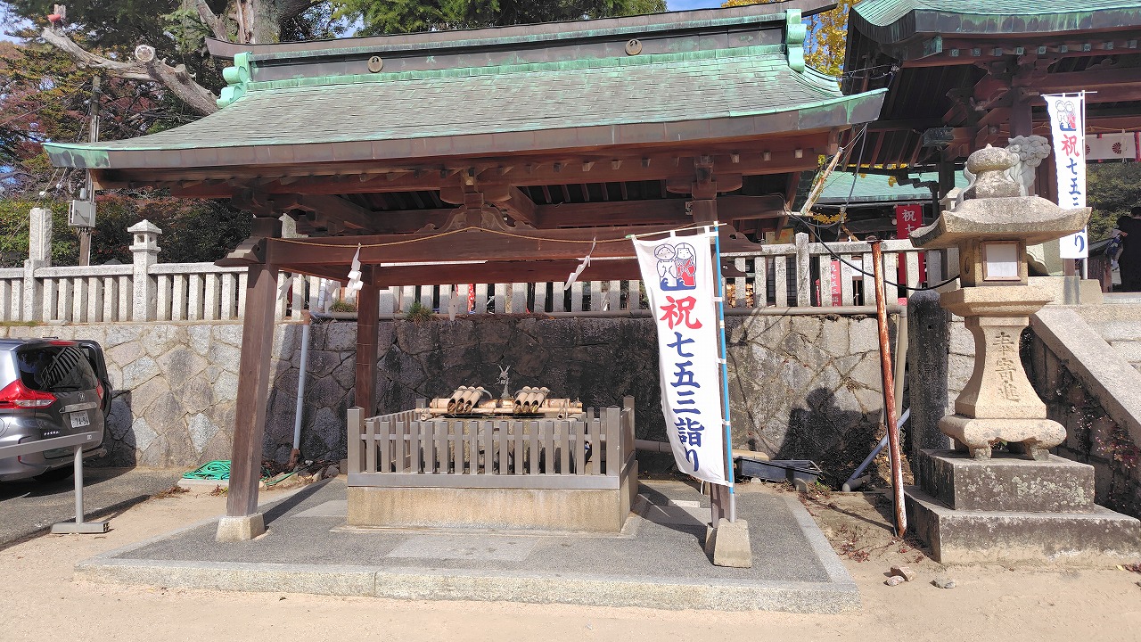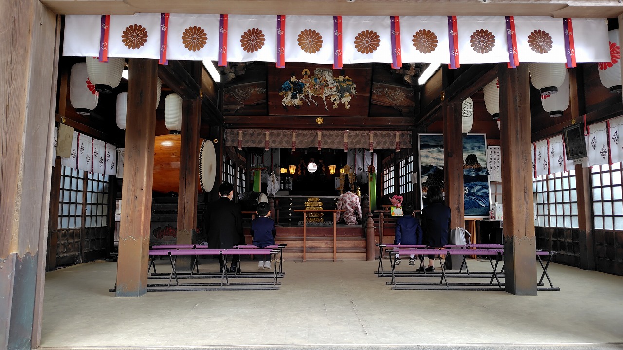 ちょうど七五三の時期ということで旗が立っている神門をくぐります。