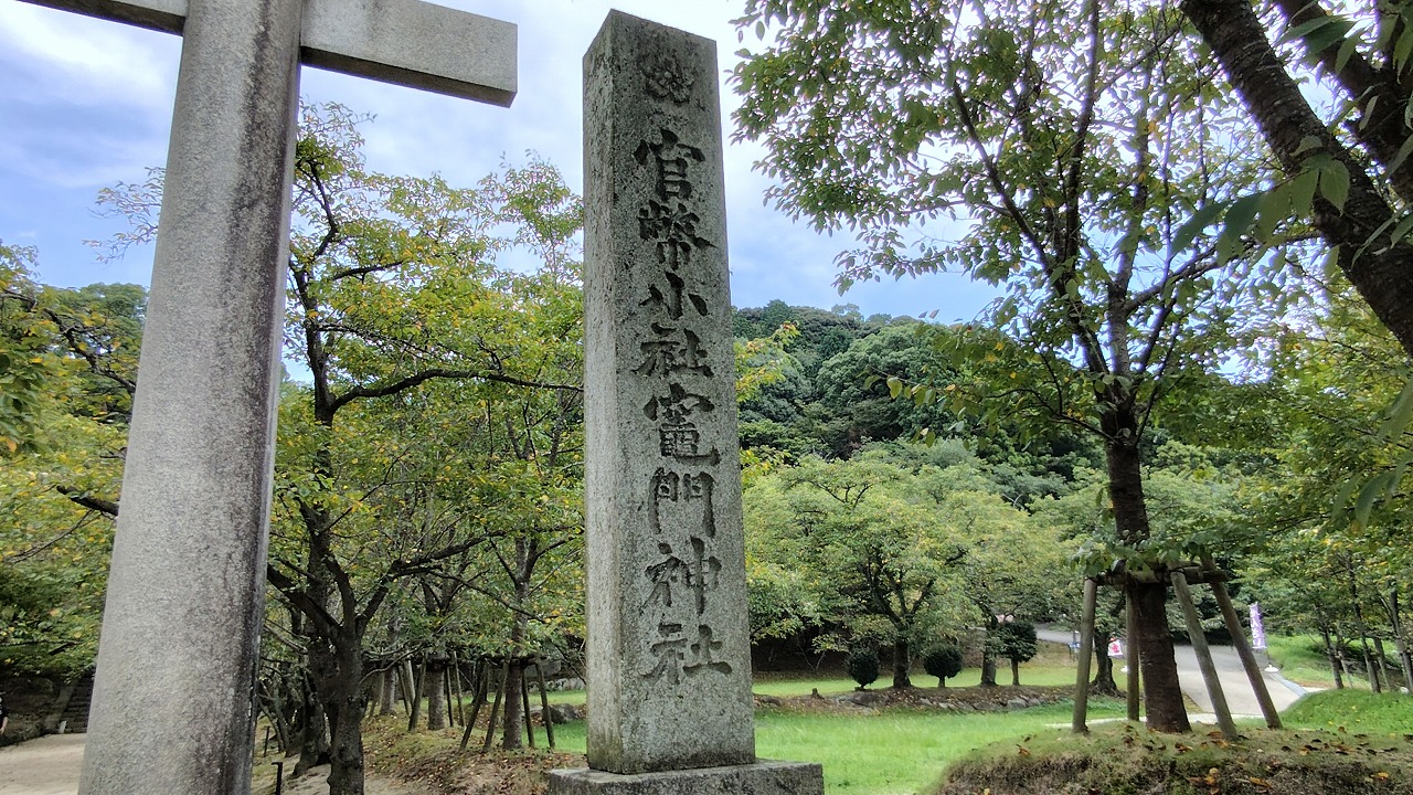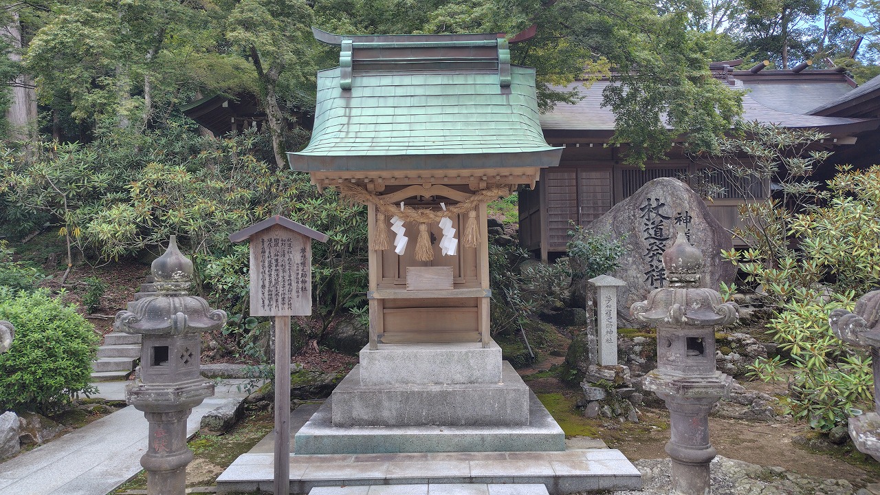 末社・夢想権之助神社。江戸時代初期に活躍した剣客で宝満山中で修業中に開眼し「神道夢想流杖術」を大成したそうです。