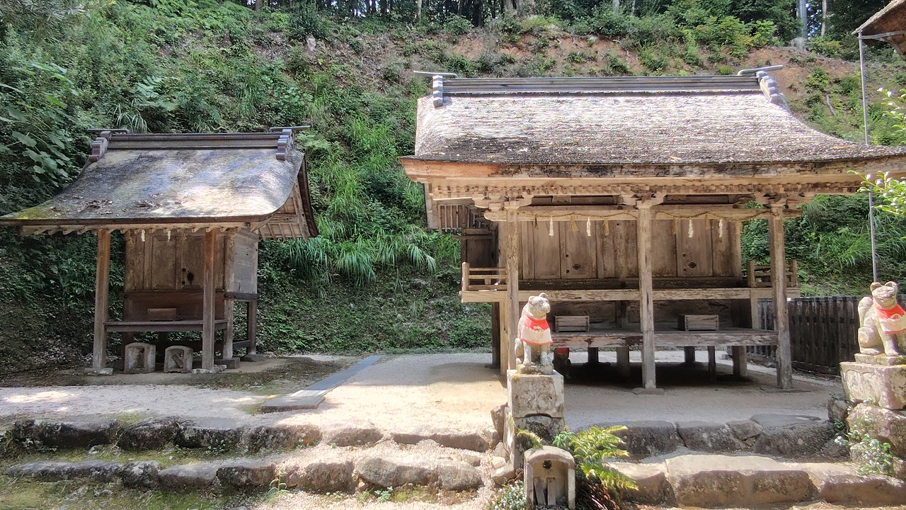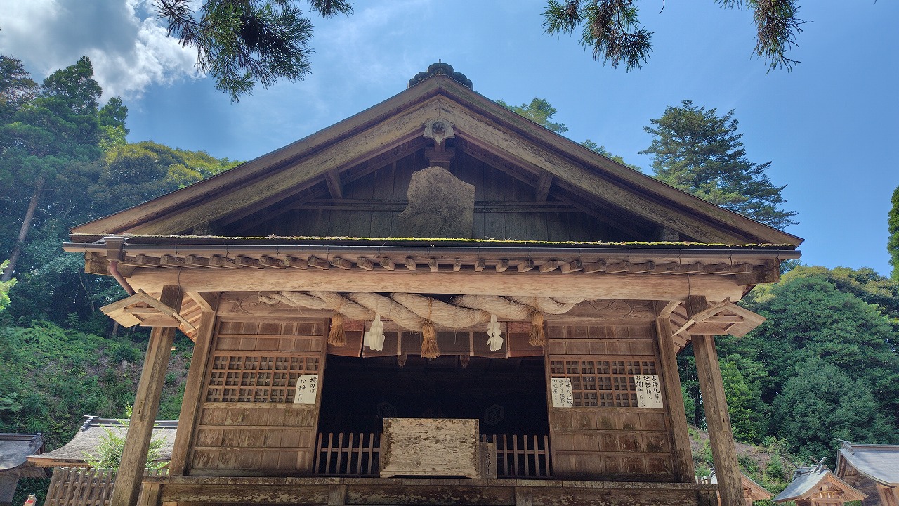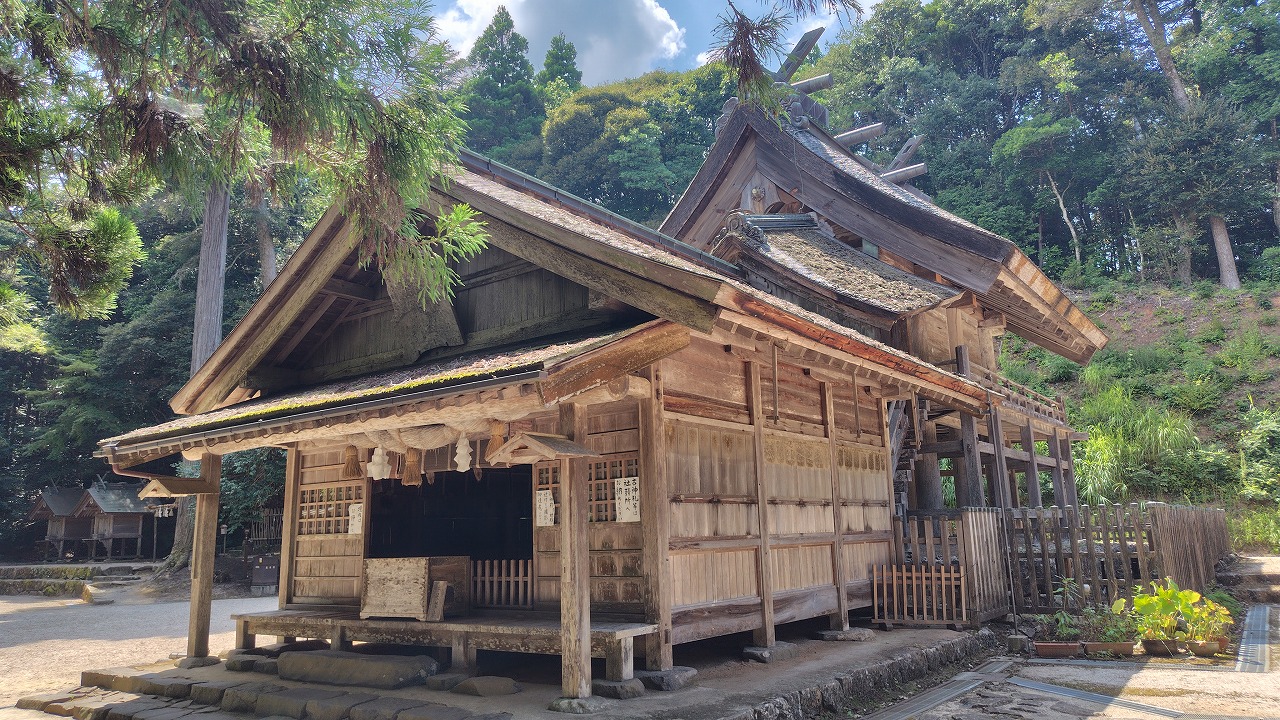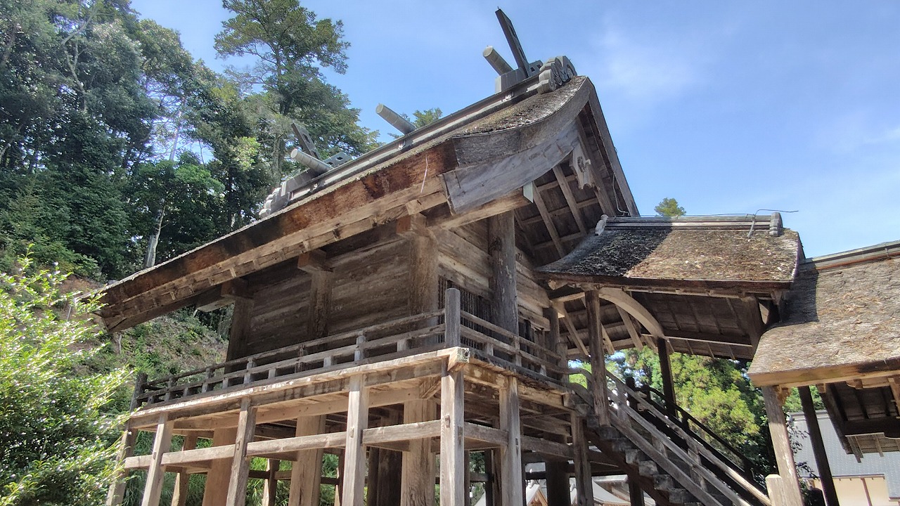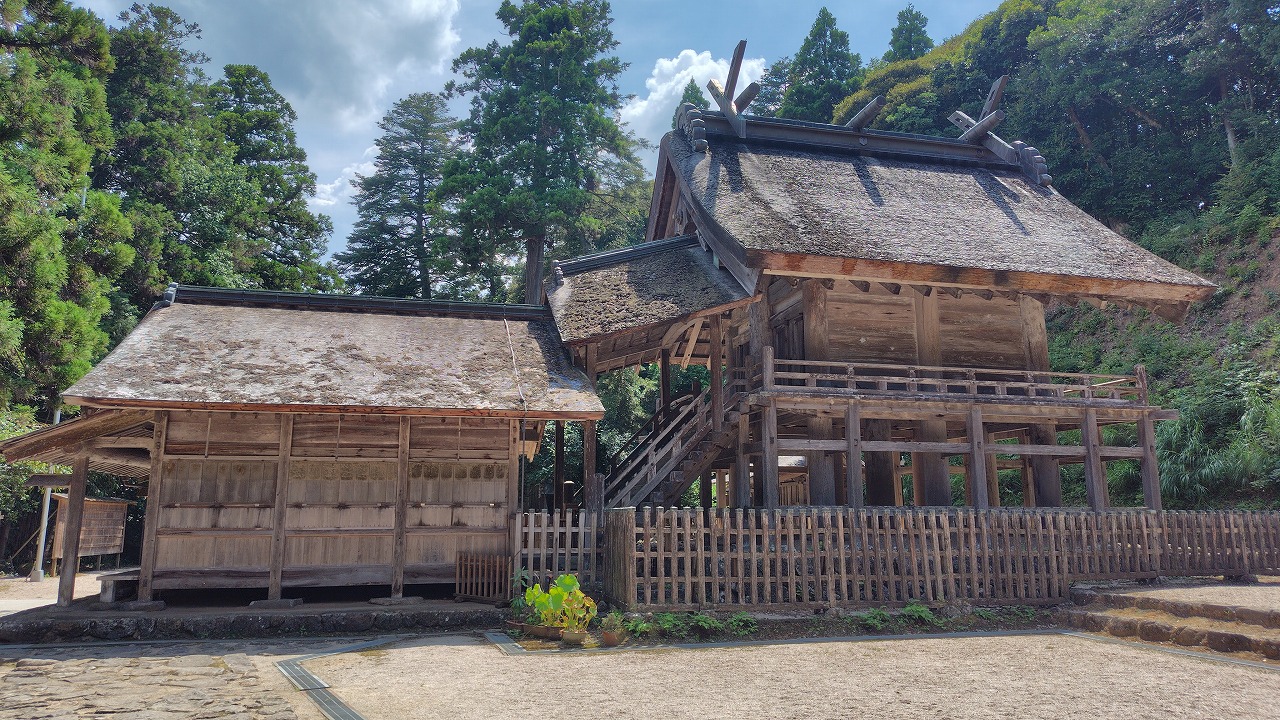拝殿と本殿を横から見たところ。出雲大社と同じく本殿が高い位置に構えている「大社造」という様式です。