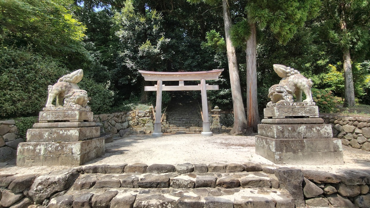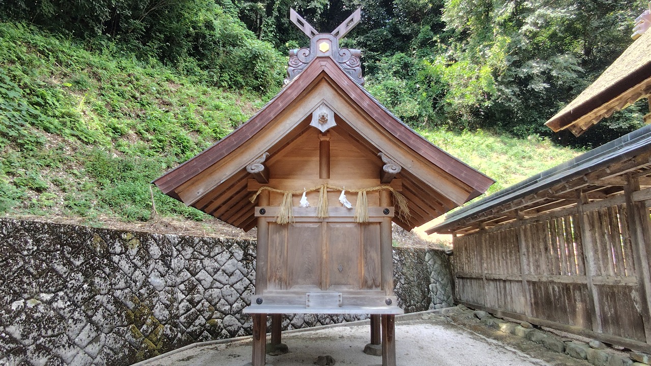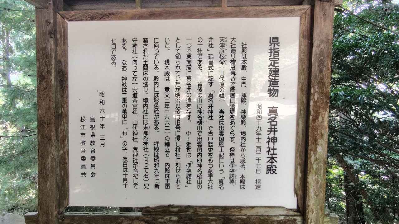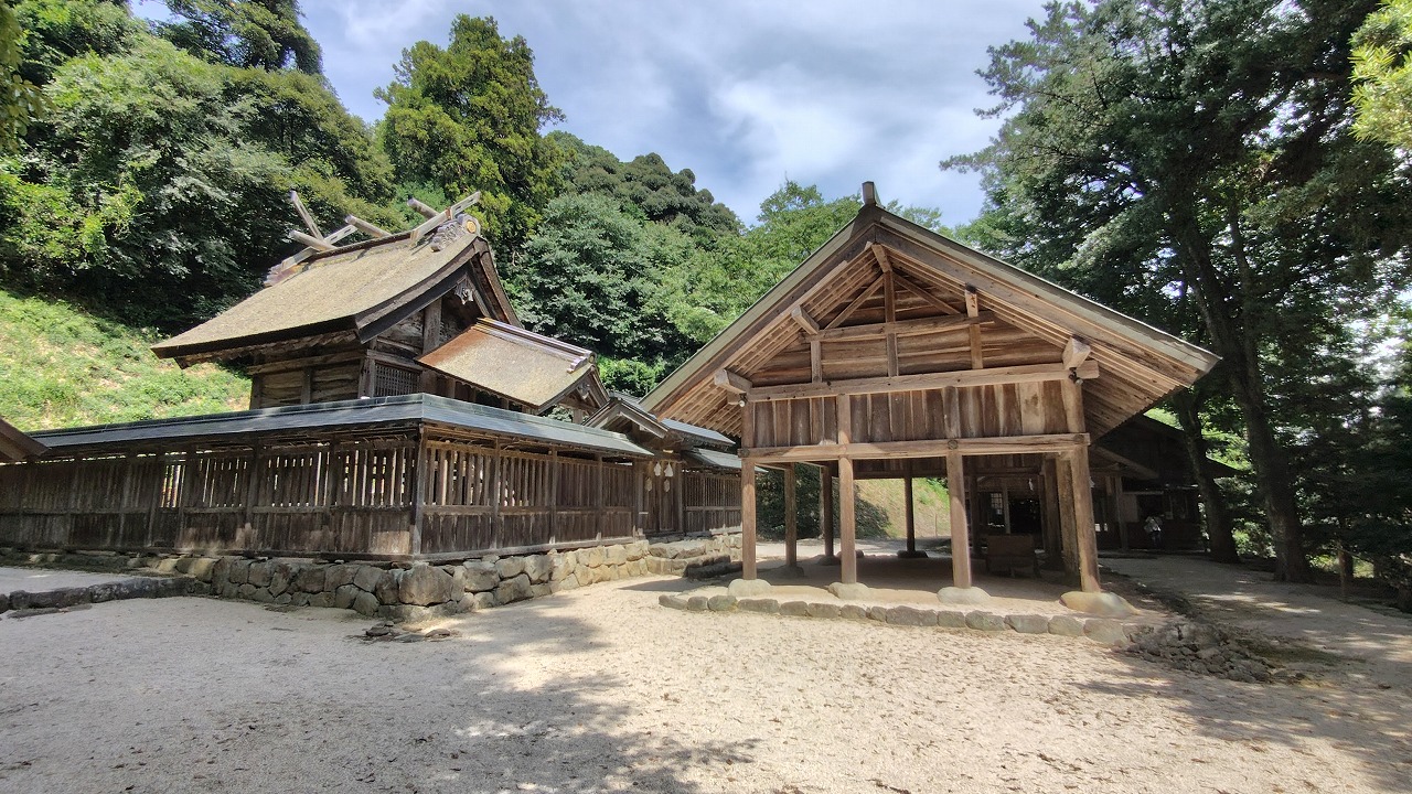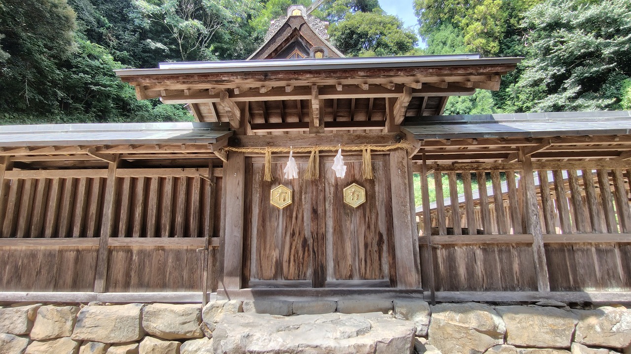 右側の拝殿は昭和9年(1934年)の建立。左側は本殿(大社造り・檜皮葺き)は寛文2年(1662年)に再建された県の指定文化財です。