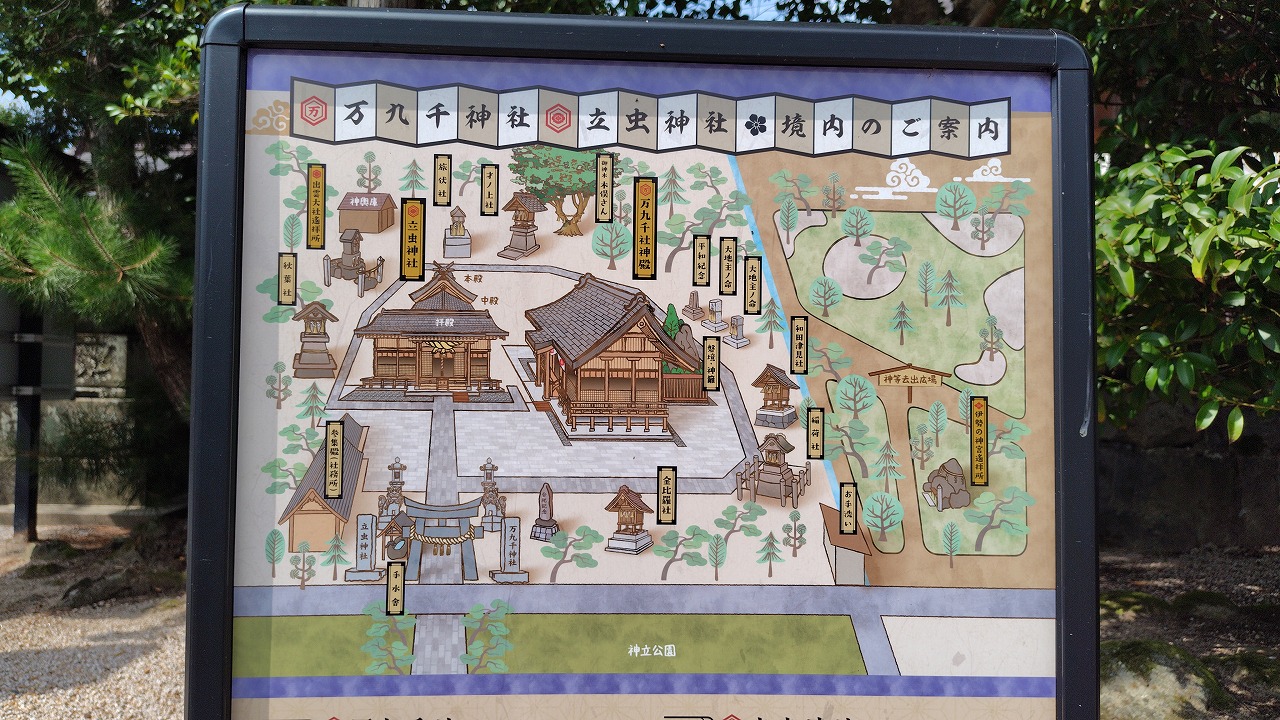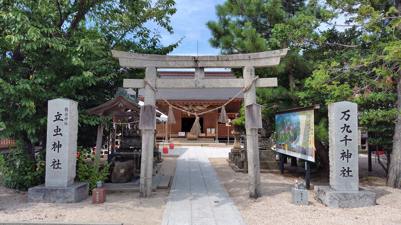 万九千社の創祀、創建は定かではなく、奈良時代に編まれた『出雲国風土記』や平安時代の『延喜式』にみえる「神代(かむしろ)社」、「神代神社」が、のちの「万九千社」にあたると伝えています。少なくとも約1300年前には、その歴史をさかのぼることができます。中世になると、当社は「神立(かんだち)社」(鎌倉時代頃)や「神達(かんだち)社」(安土桃山時代)と称されていました。近世になると、「神立大明神」、「万九千大神」などと称され、明治維新以降は、立虫神社(旧村社)の境内社(旧無格社)、「万九千社」として祭られています。現在の神殿は、平成26年10月10日に明治11年以来、136年ぶりにお建て替えのうえ正遷宮されたものです。