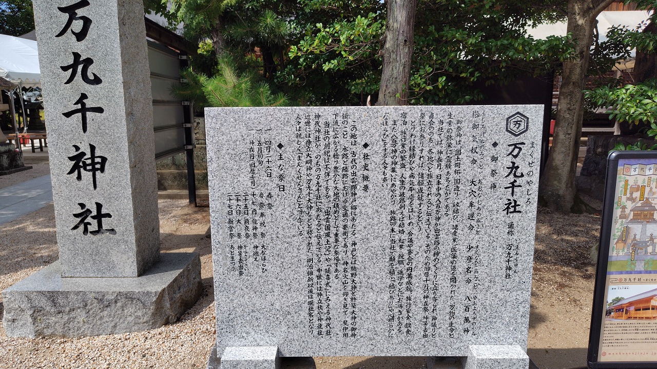 元々、斐伊川の中洲に鎮座していましたが、江戸時代前期、寛文10年(1670年)、洪水の影響により現在の万九千社境内に遷されました。