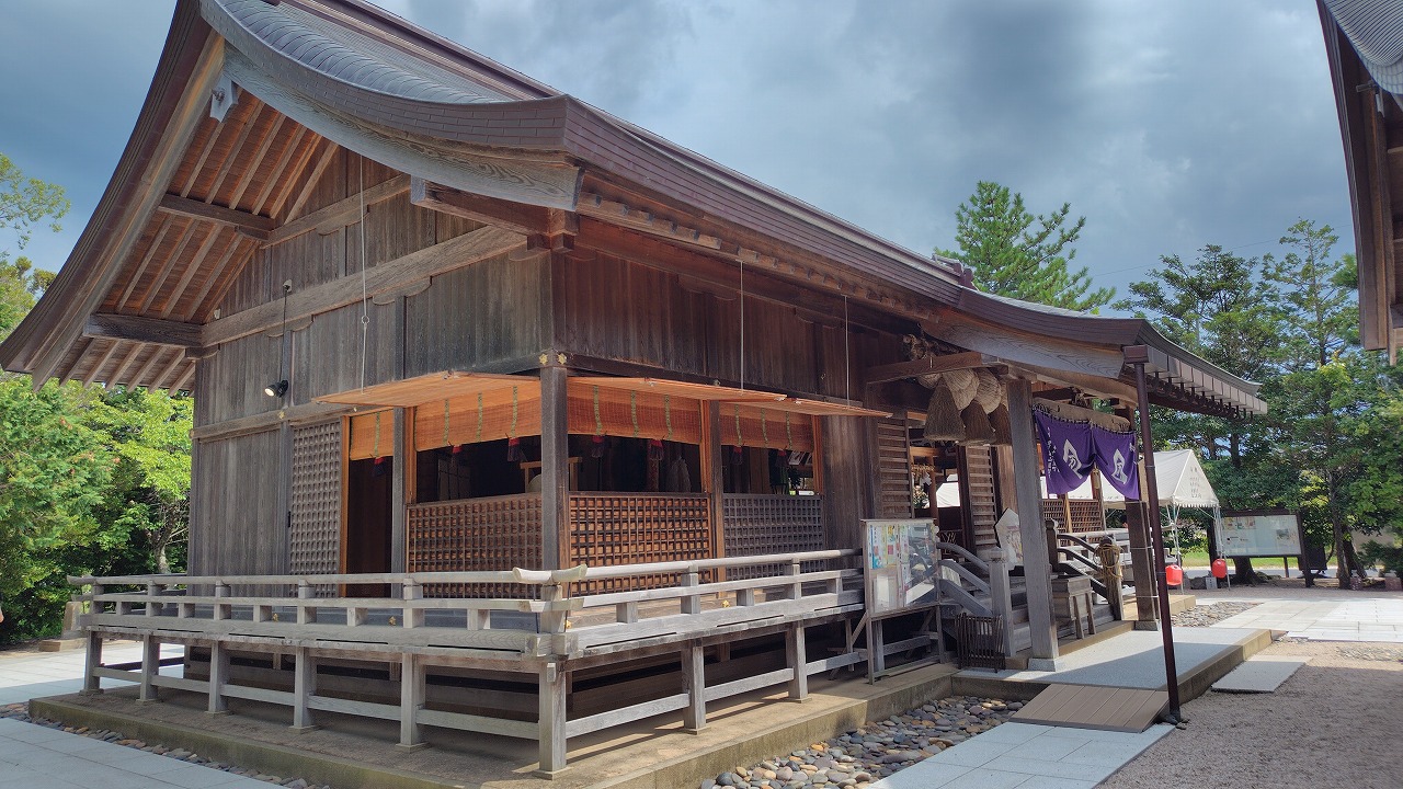 島根県出雲市に鎮座します。神在祭(毎年の神在月、旧暦10月)に際し、全国から出雲へと参集された八百万神が最後にお立ち寄りになるとの神話を今に伝えています。