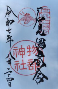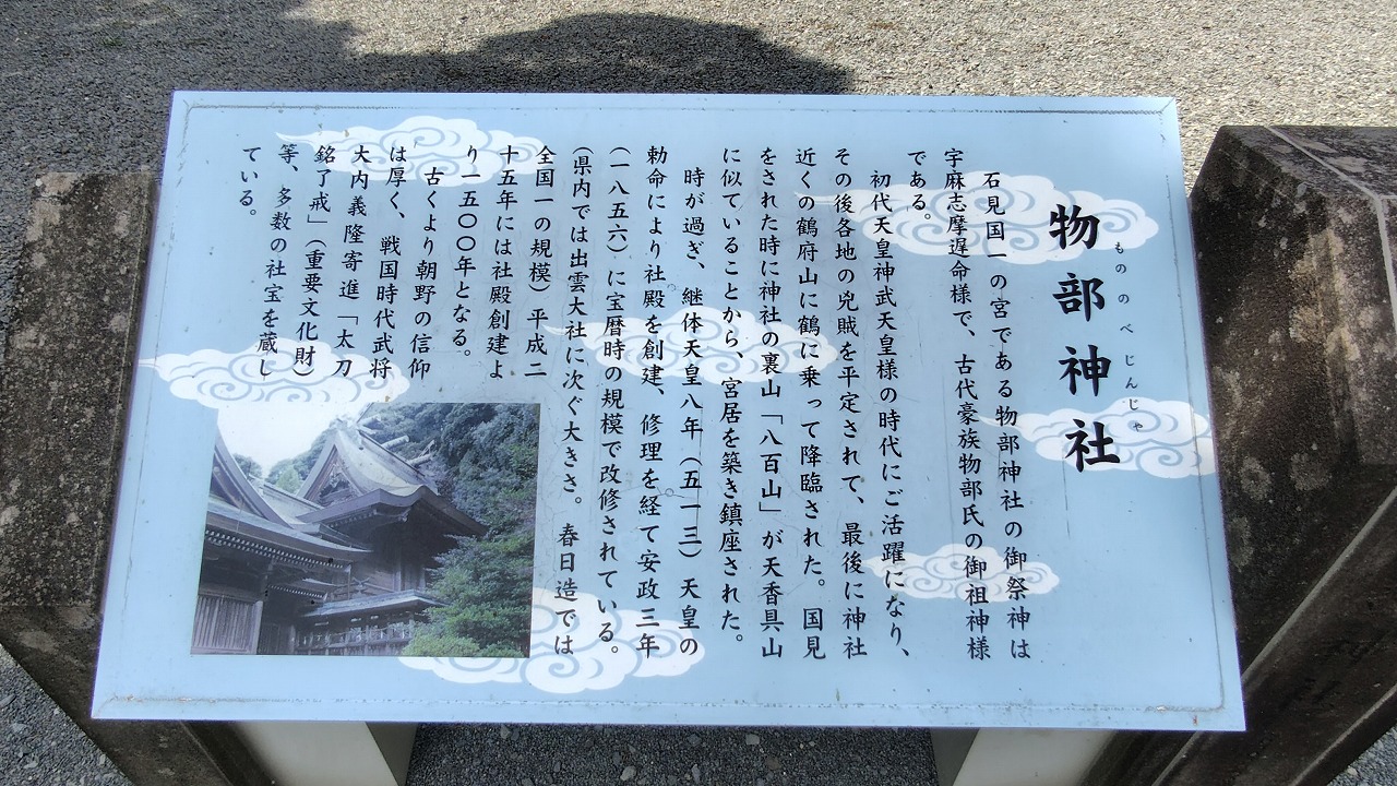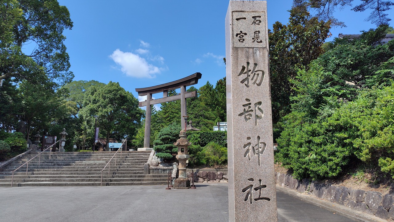 石見国造は立国当初は大屋古命家が就任していましたが、景行天皇の御代(西暦71~130年)に物部竹子連が国造を就任すると物部家が神官と国造を歴任し、必然的に物部神社が石見国一宮に格付けされました。日本三代実録によると貞観11年(869年)正五位下、貞観17年(875年)に正五位上、元慶3年(879年)従四位下に列し、平安時代に成立した延喜式神名帳には式内社として列記されています。歴代領主からも篤く庇護され社運も隆盛し、最盛期の天文年間(1532~1555年)には社領1万3千石にも達しましが、戦国時代の兵火や度重なる領主の交代により天正年間(1573~1592年)には2千石となり、江戸時代には300石と減少しています。