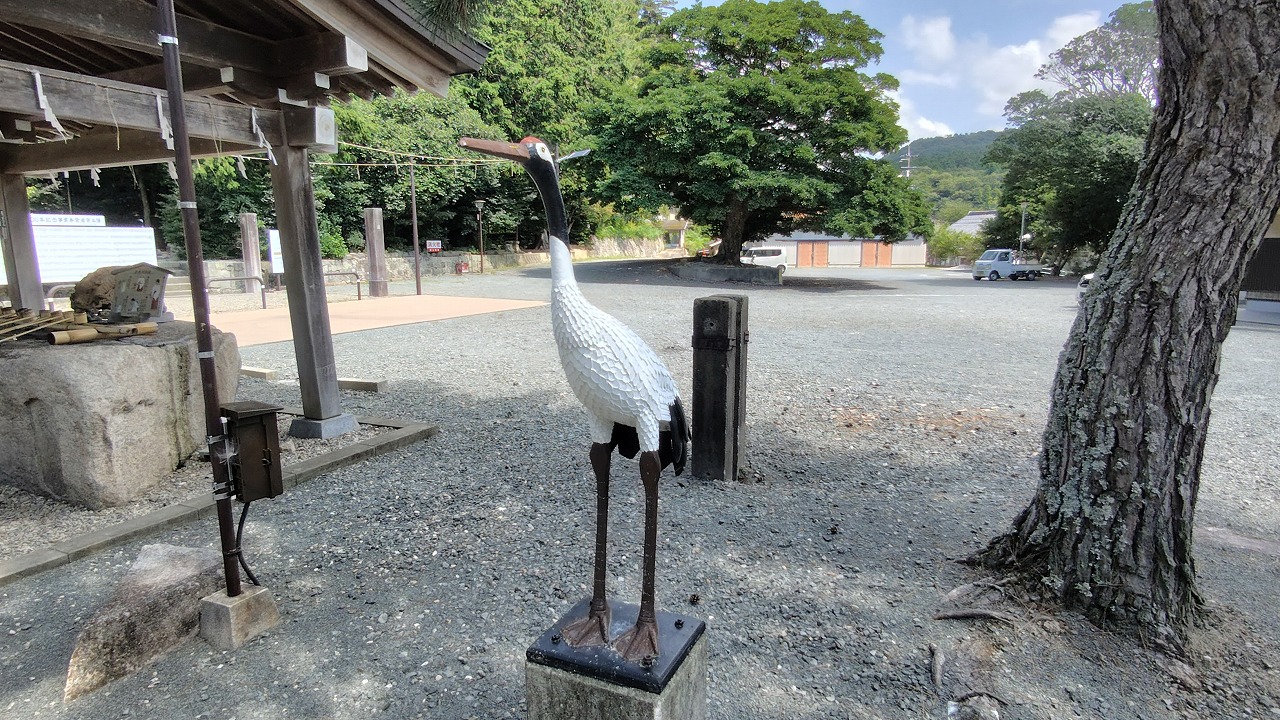 なんで鶴がいるんだろうと調べたら、御祭神はこの地を平和で豊かな地域とするため、鶴に乗って降臨されたそうです。狛鶴も珍しい。