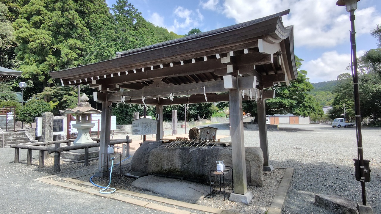 手水舎には、砂金が含まれている「富金石(ふきんせき)」で造られた手水石があり、曲玉の形をした石が埋め込まれ、浄・勝・財・健・徳の字が彫られています。手水を使ったあとに触ると、勝運や財運などの御利益が授かれるそうです。