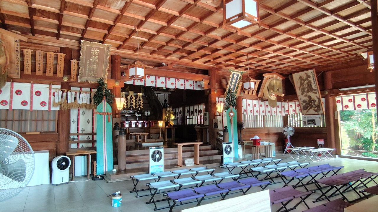 拝殿は横に長い構造でした。注連縄の奥の赤い御神紋「ひおい鶴」は全国唯一とのこと。