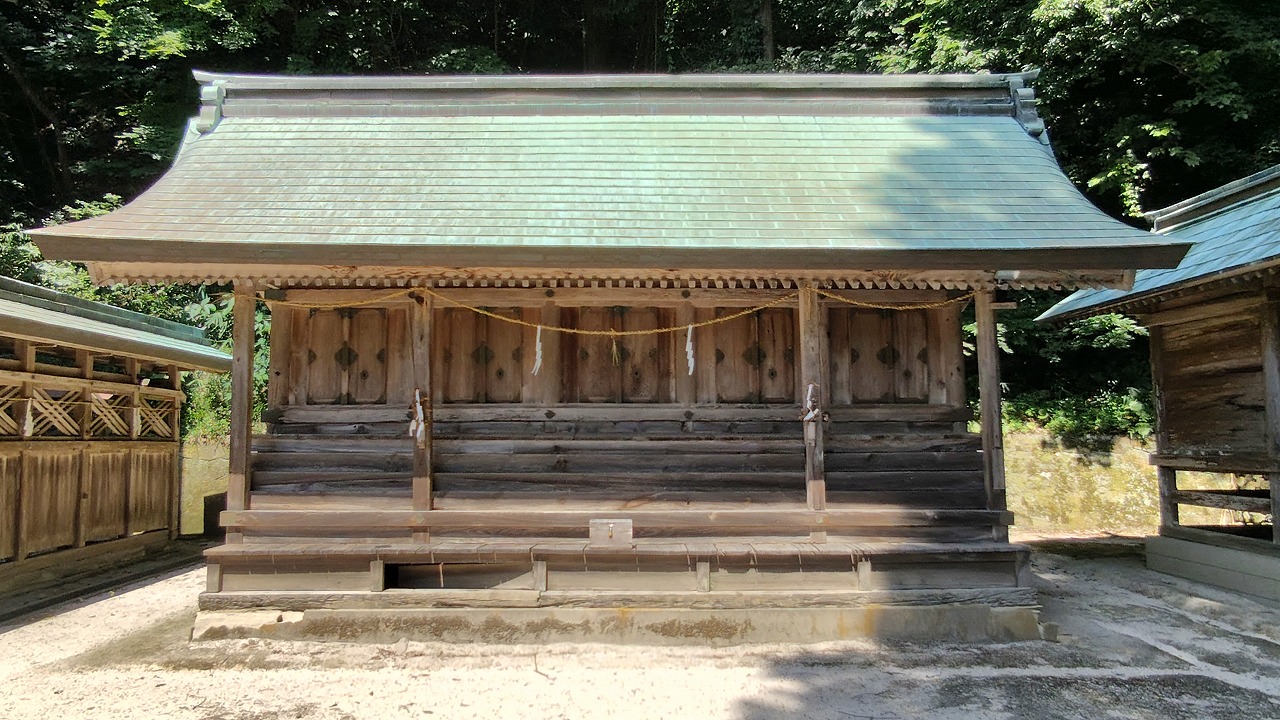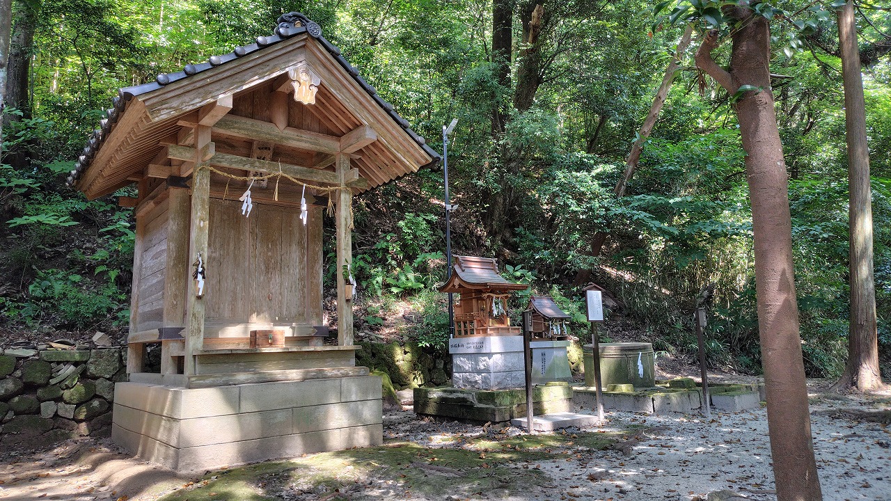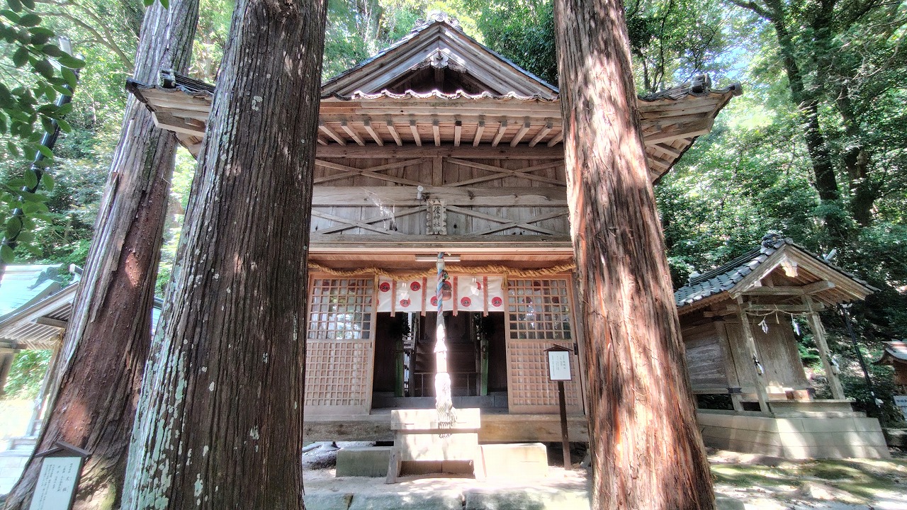 2本の杉に守られるように鎮座しているのが後神社。御祭神の妃である師長姫命(しながひめ)を祀っています。