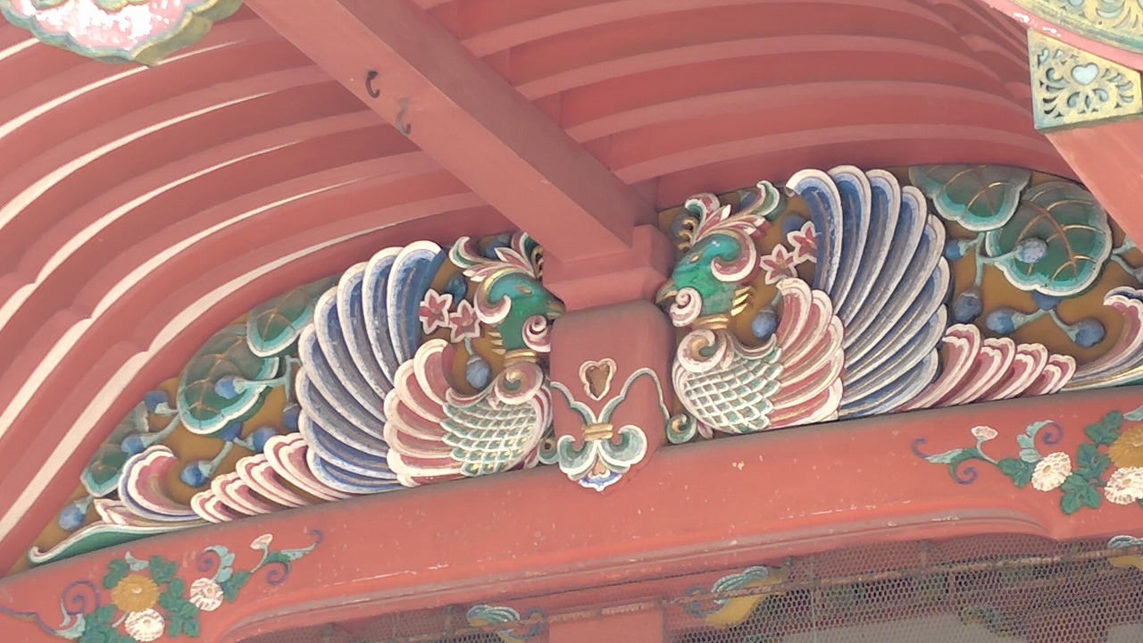 本殿、幣殿、拝殿、前拝、東西楽舎は漆下地丹塗・極彩色仕様、銅板葺による社殿です。