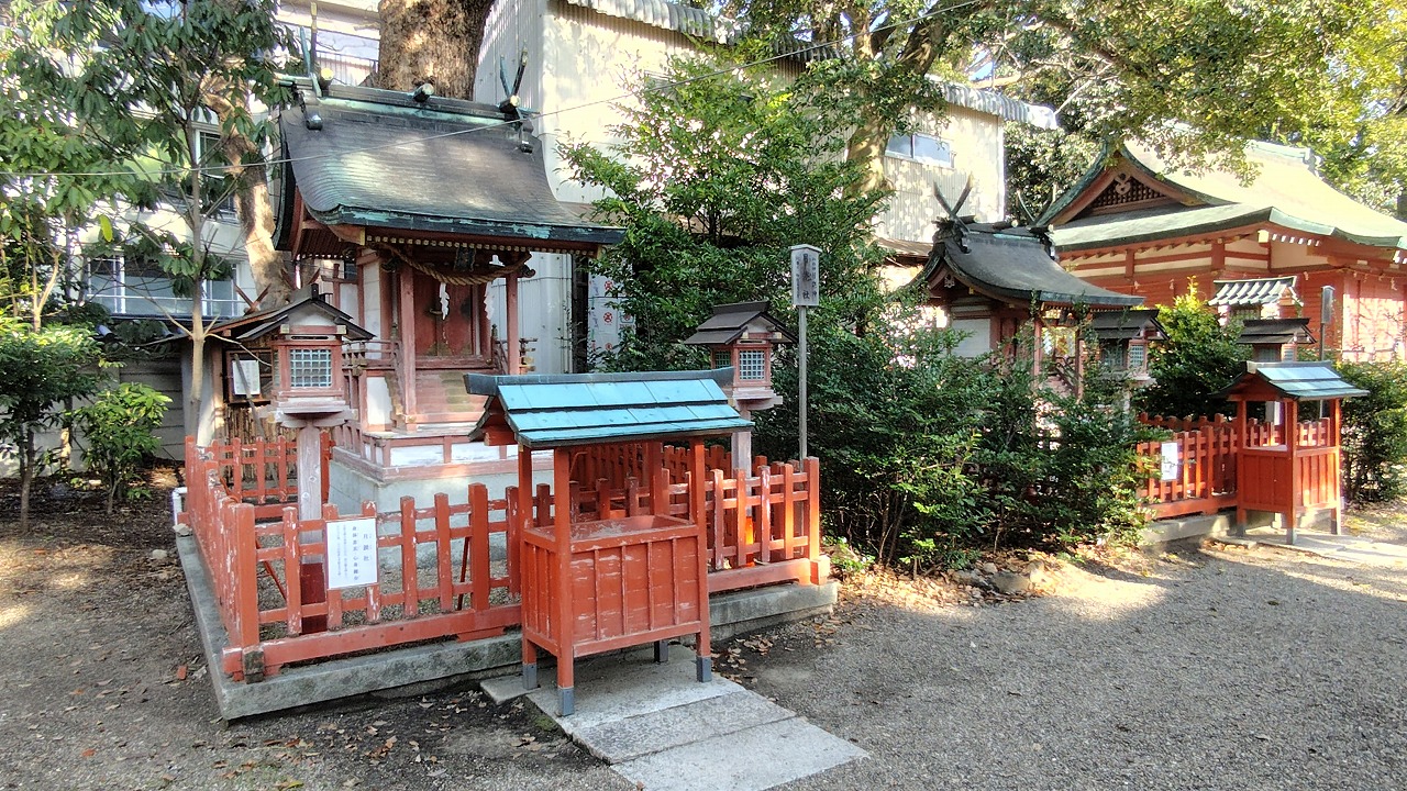 本殿左側には、手前から蛭子社(商売繁盛の神様)、出雲社(縁結びの神様)が鎮座します。