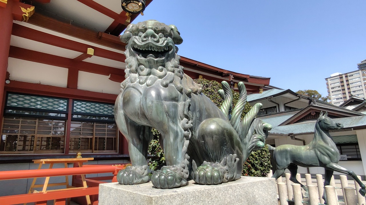 拝殿前のブロンズ製の狛犬様。足が大きくて尻尾がうねっていました^^;