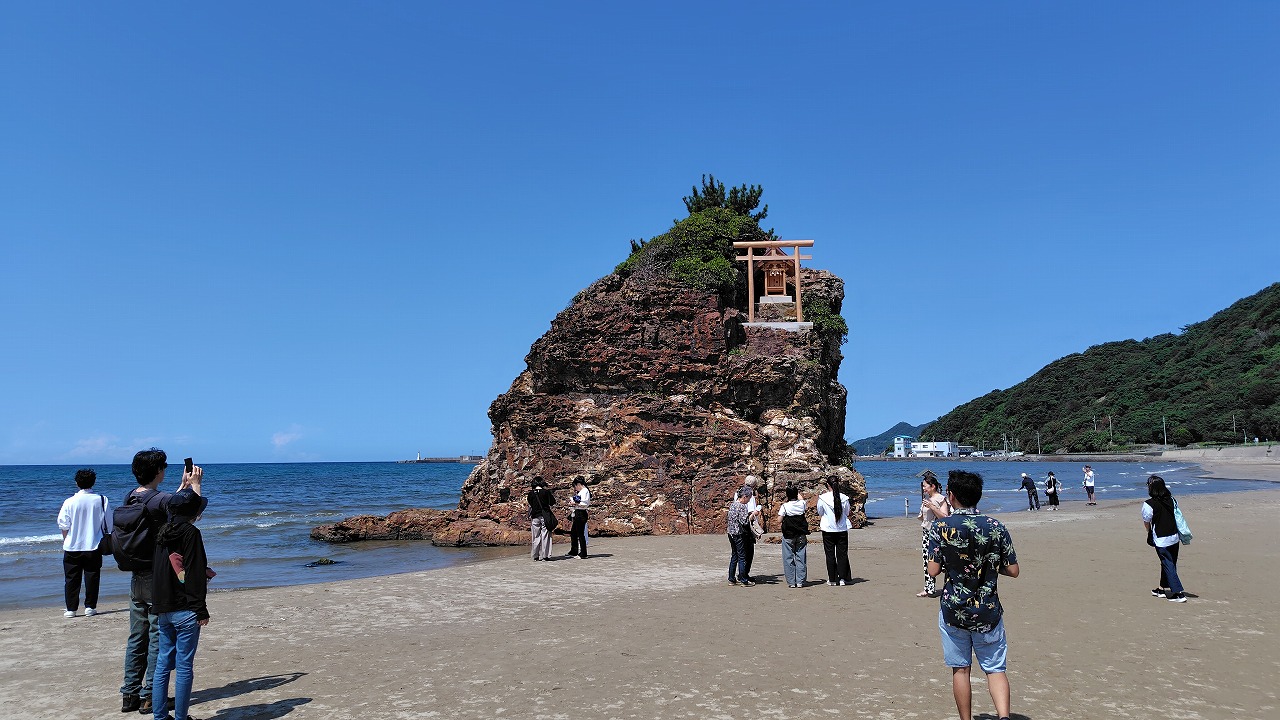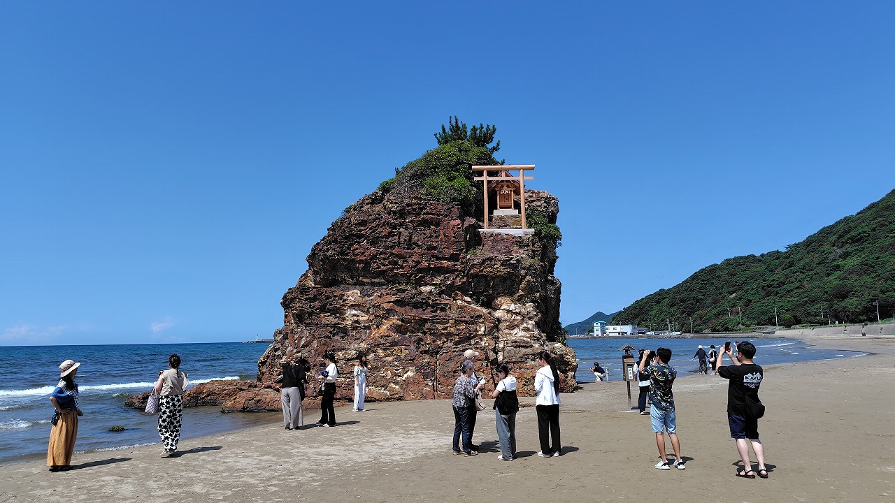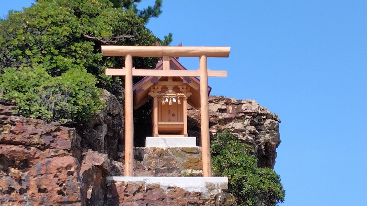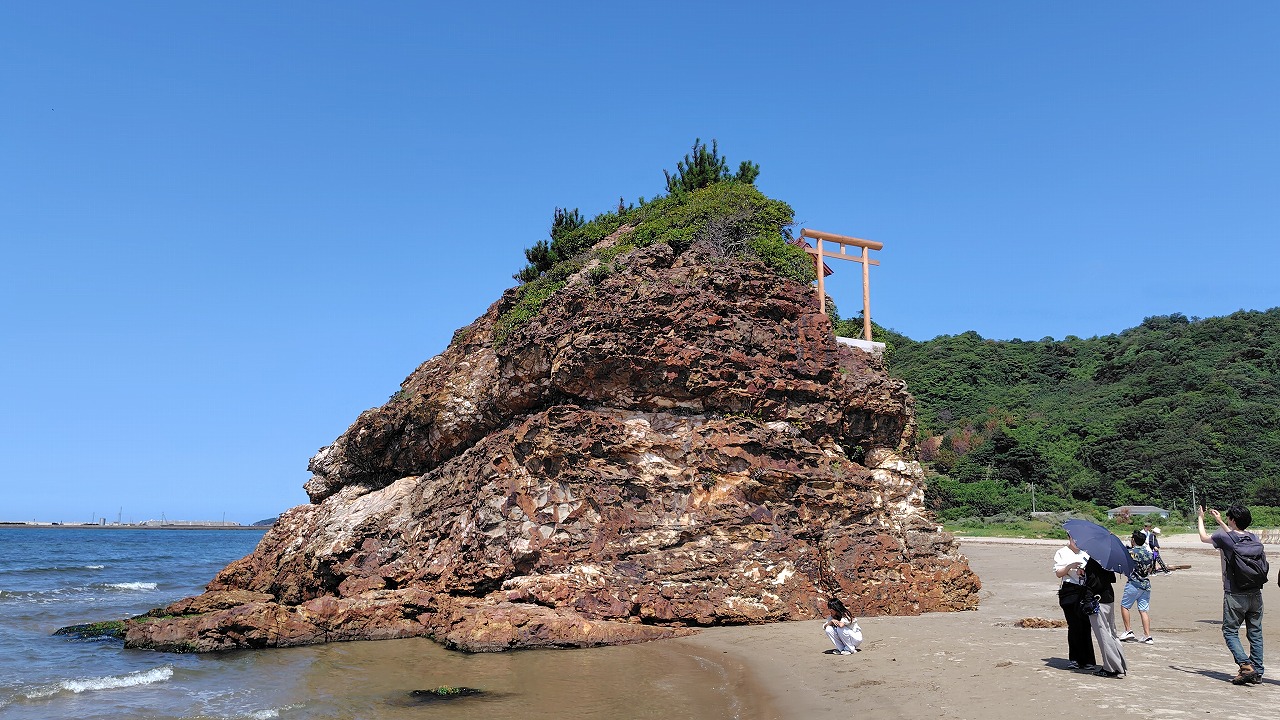 出雲大社の西側約1kmぐらいの場所に稲佐の浜という海岸があります。稲佐の浜は、神話に出てくる国譲りや国引きの舞台として登場する場所です。旧暦10月10日に全国の八百万の神様たちをお迎えする場所でもあり、出雲大社ととても深い繋がりのある海岸です。稲佐の浜には「弁天島」という大きな岩があり、岩の上に「沖御前神社」という小さなお社があります。かつては弁才天を祀っていましたが、現在は豊玉毘古命を祀ります。豊玉毘古命は神武天皇の祖母で海や水の女神、海の安全を守る神、漁業の神として慕われています。
