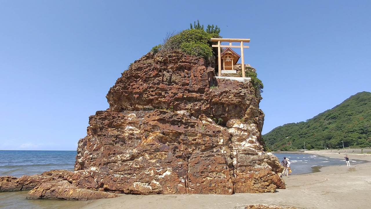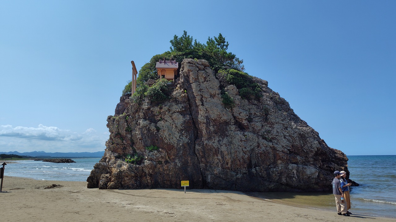昭和60年前後までは、島の前まで波が打ち寄せていたそうです。今は島の前まで歩いて行くことができます。