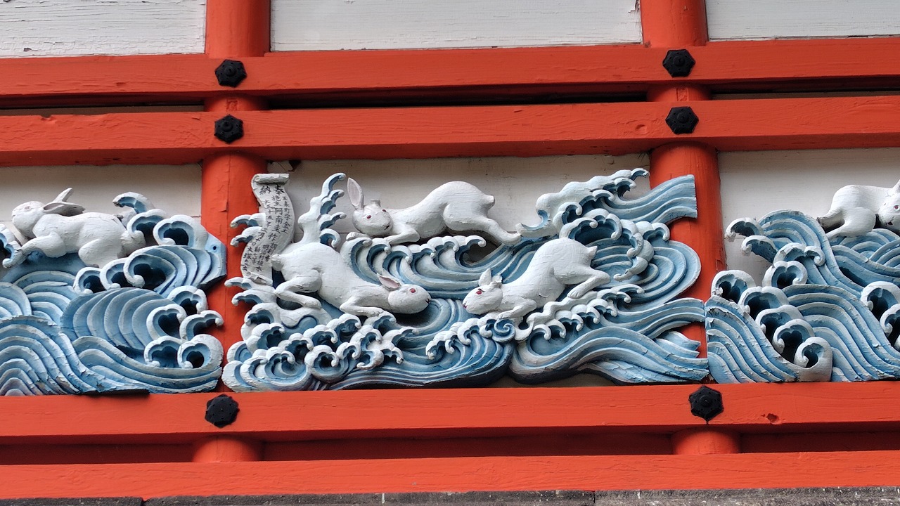 拝殿裏側に兎の彫刻がありました。横側には鶴と亀。反対側には龍も彫られています。