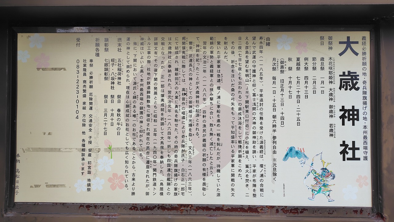 鳥居付近の由緒書き。下関で源氏とゆかりのある唯一の神社です。