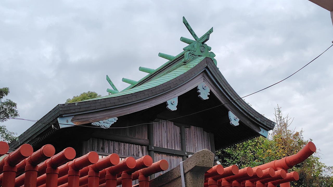 本殿は薄緑色の屋根の流造りでした。