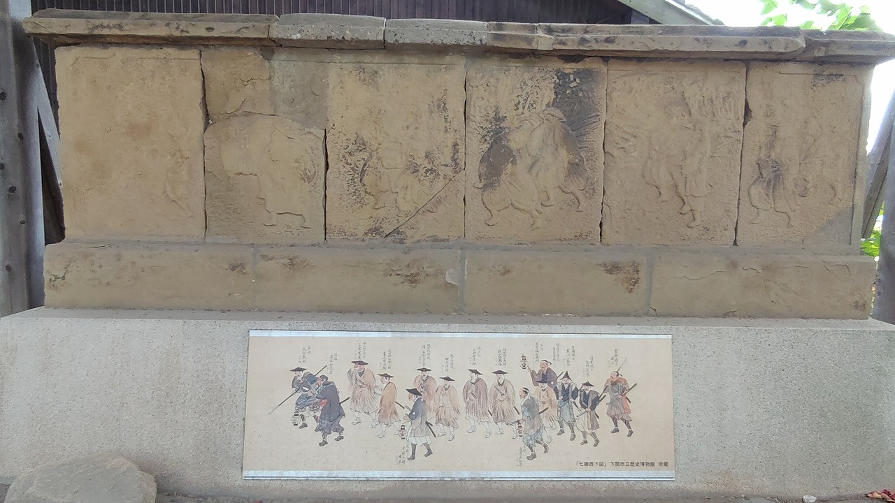 境内にある「七卿落ち」の画碑。「七卿落ち」とは、文久3年(1863)8月、京都朝廷で起こった政変により、反幕派7人の公卿が京都から追放され長州に下った事件です。