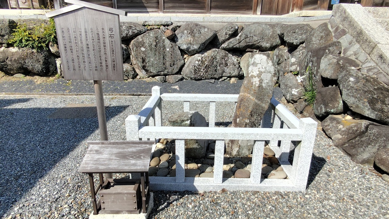 この石は「弓石」といい、佐太大神が加賀の潜戸でお生まれになった神話に因むものと伝わります。