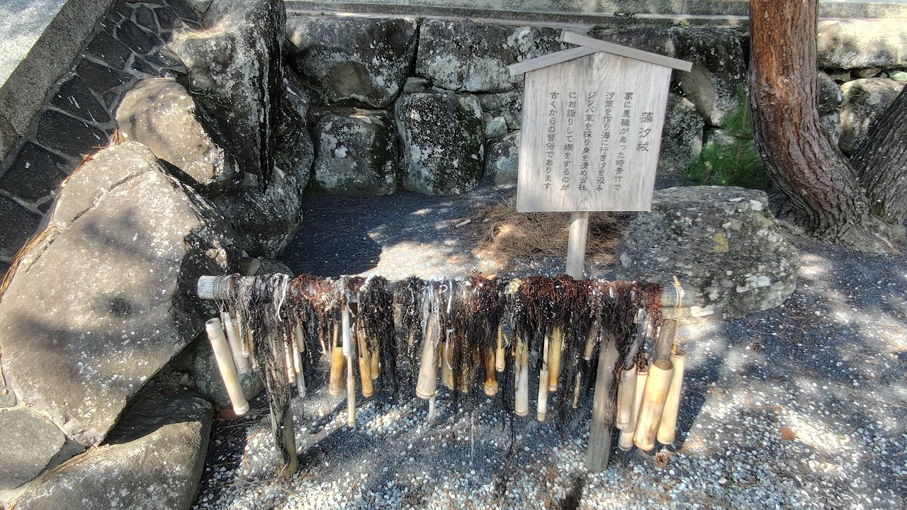藻汐祓。家に悪穢があった時、青竹で汐筒を作り、海に行き汐を汲み、ジンバ草を採り身を清めお詣りして祓をするのが古くからの習俗です。
