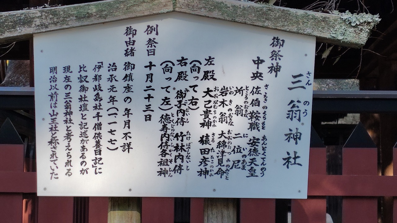 創建の具体的な年代は不明ですが、平安時代に平清盛が、近江の山王社(日吉大社)から勧請し創建したのが始まりとされています。明治以前までは山王社と称されていました。明治維新後には、島内にあった末社を次々と合祀し、多くの御祭神を祀っている現在の形となりました。佐伯鞍職を佐伯翁と称し、所翁、岩木翁が祀られていることから、いつしか三翁神社と称されるようになったそうです。昭和29年には、右殿に祀られていた平清盛公が分祀され、西の松原に清盛神社が創建されています。