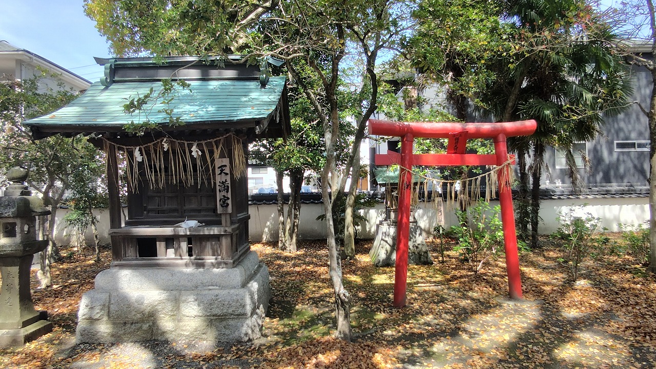 本殿の周囲には境内社が鎮座します。左側から天満宮、稲荷社。