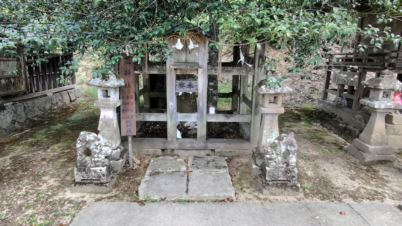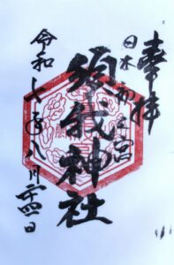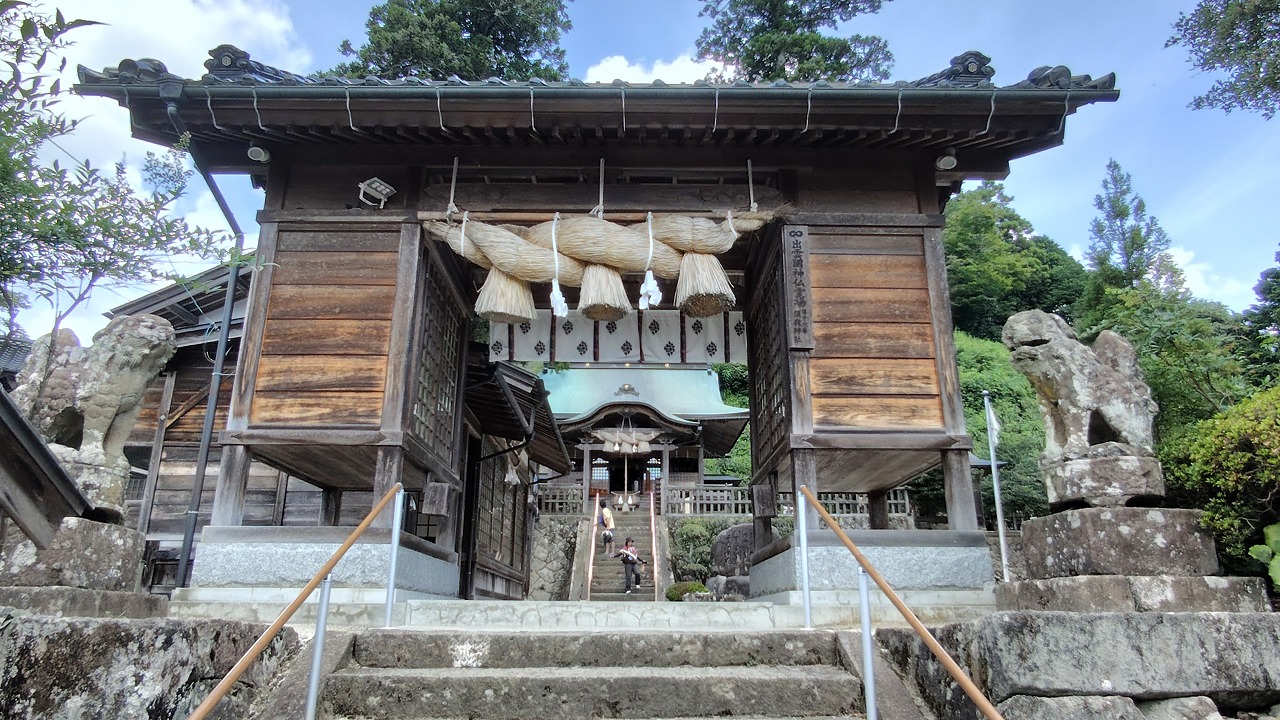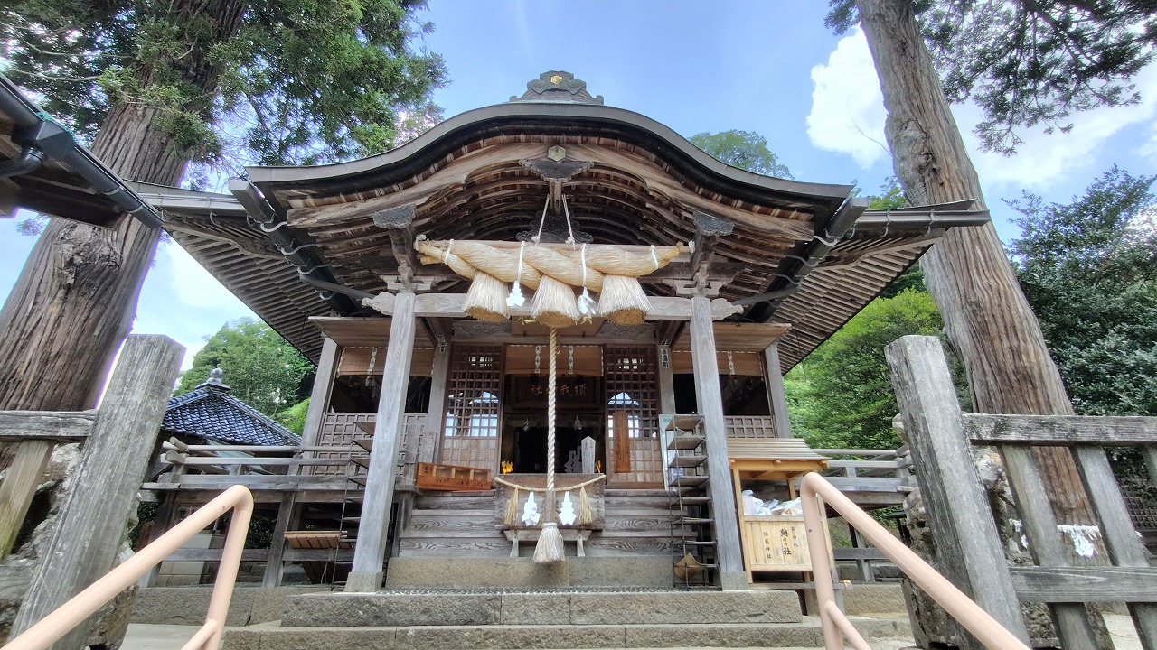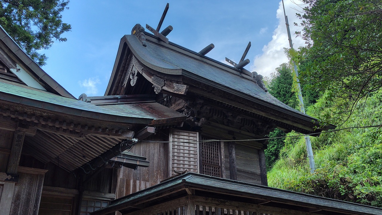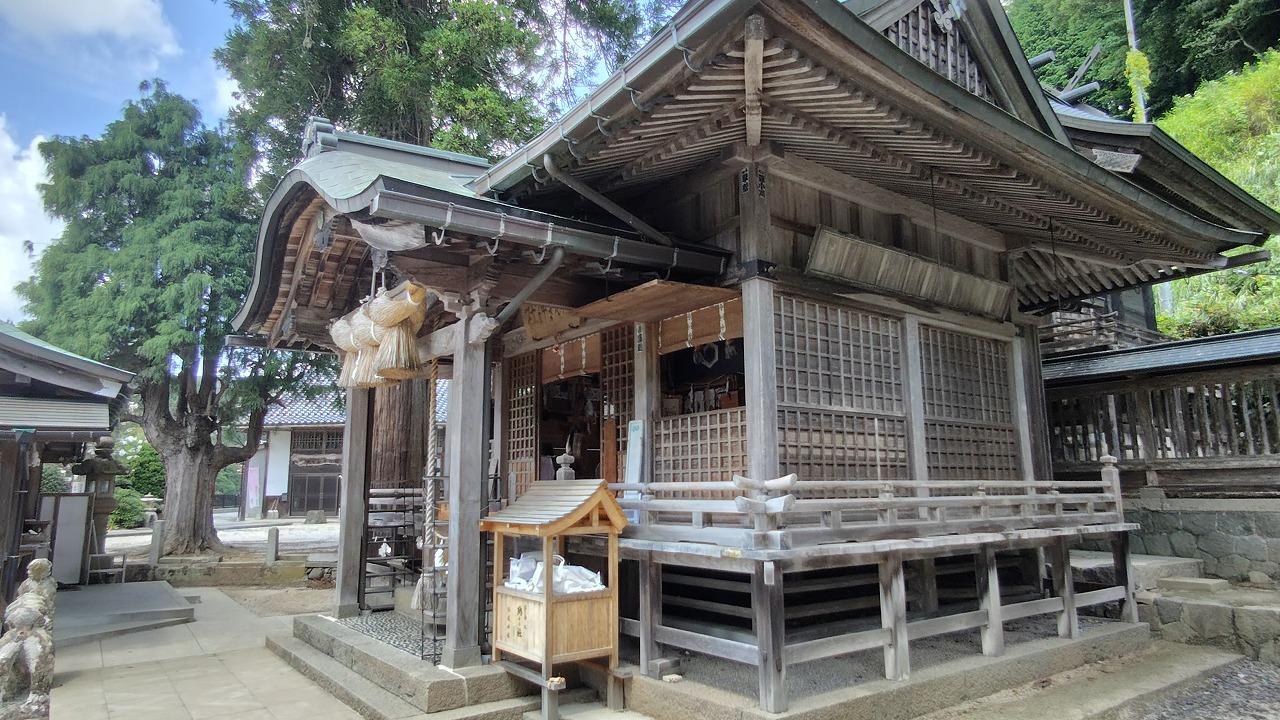 本殿は大社造り。千木は男千木、御神紋は二重亀甲に藤の花、方角は南西を向いています。