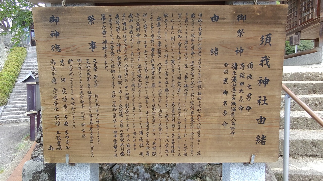 出雲風土記(天平五年・733年)ではここを須我神社、須賀山、須我小川などの名前に表現され、風土記抄(天和三年・1683年)には須我村とあり、須我は広くこの地方の表記であったことがうかがわれます。