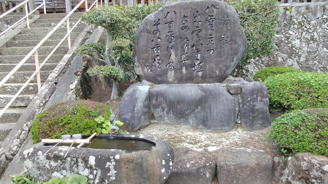 八岐遠呂智(やまたのおろち)を退治した須佐之男命は、稲田姫と共にこの須賀の地に至り「吾が御心清々し」とおっしやつて宮造りをなさった。そのとき美しい雲の立ち昇るのを見て、「八雲立つ 出雲八重垣 つまごみに 八重垣つくる その八重垣を」と歌い、日本で始めての宮殿を作り、鎮まりました。これが古事記・日本書紀に記載されている「須賀宮」であり、日本初之宮であります。 三十一文字の歌も日本で一番古い歌であり、この地が「和歌発祥の社」と呼ばれる由縁でもあります。また、この歌の中の「出雲」が出雲の国名の起元であり、「八雲立つ」は「出雲」の枕詞であります。