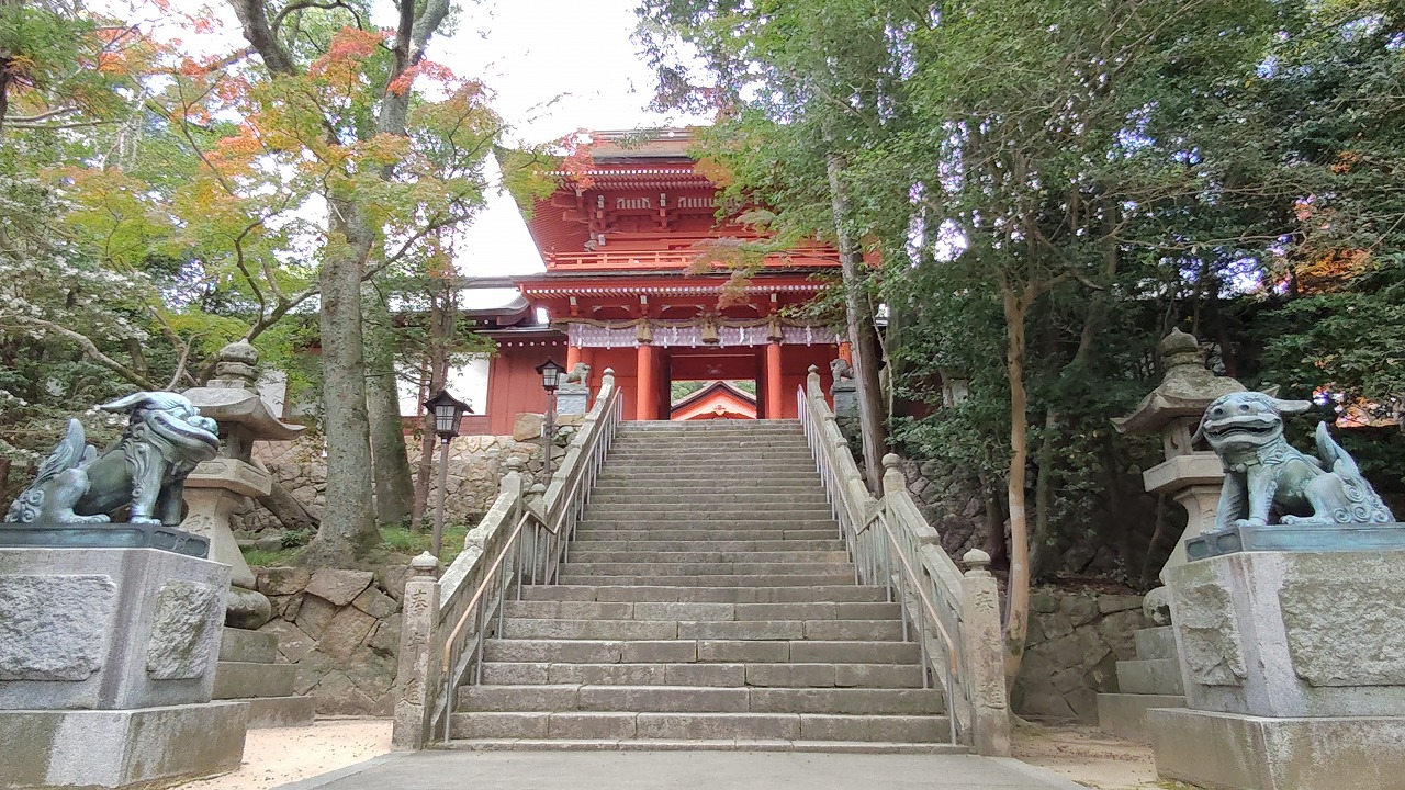 石段の先に色鮮やかな楼門が見えてきました。現在の楼門は、室町期の楼門を再興する形で、明治34年(1901年)に建てられました。国指定の登録有形文化財です。