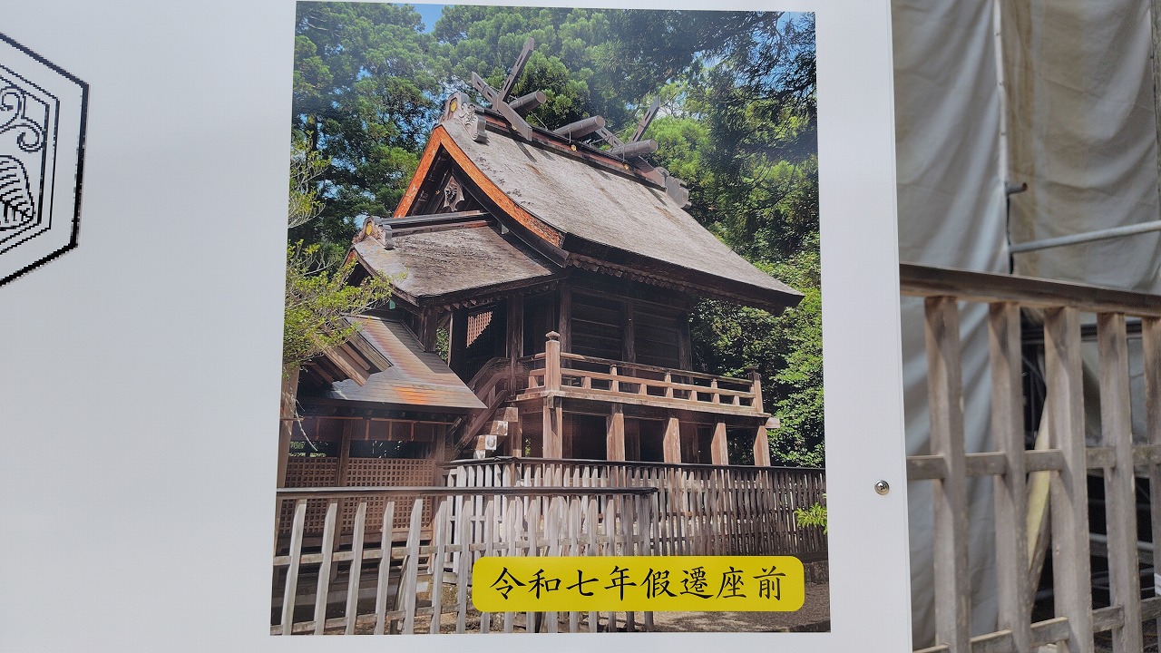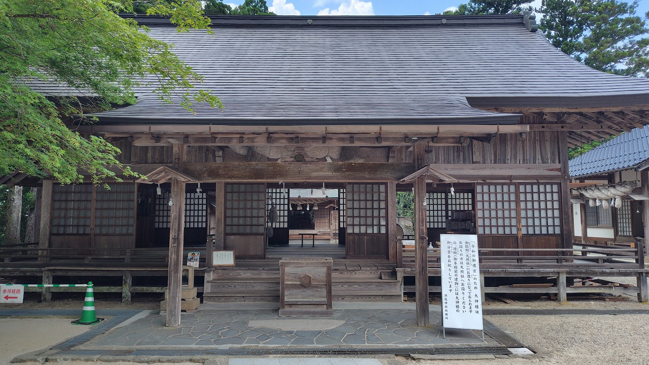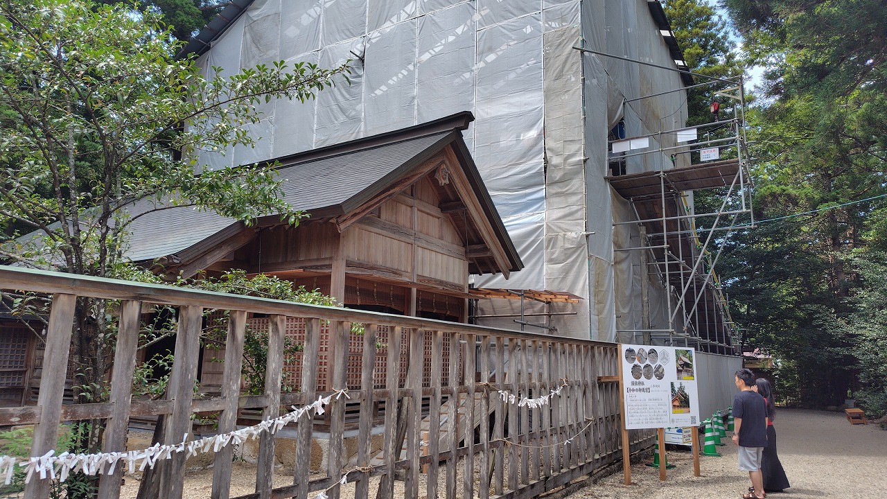 1861年(文久元年)建築の本殿(県指定文化財)は屋根葺き替え工事中でした。令和7年11月までの予定だそうです。