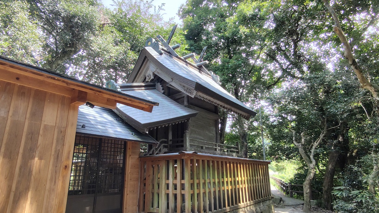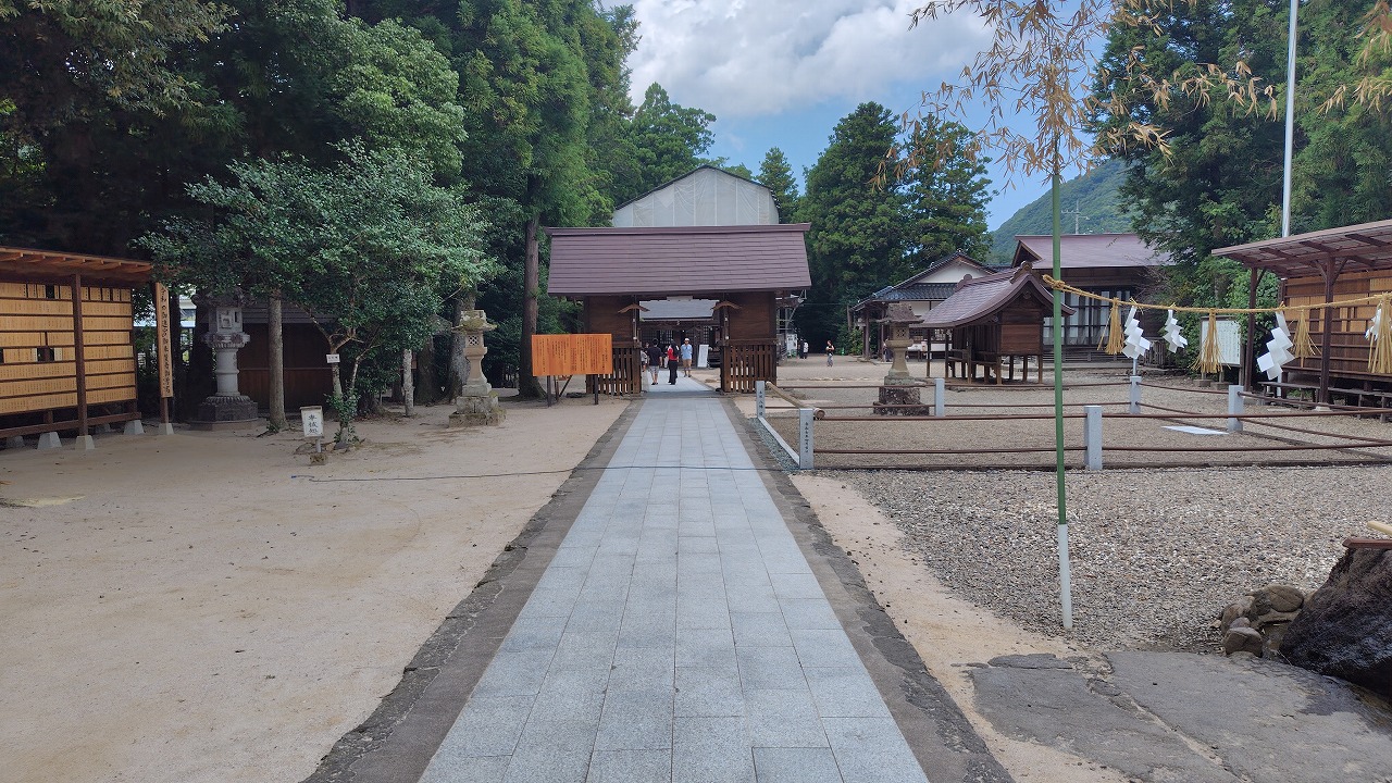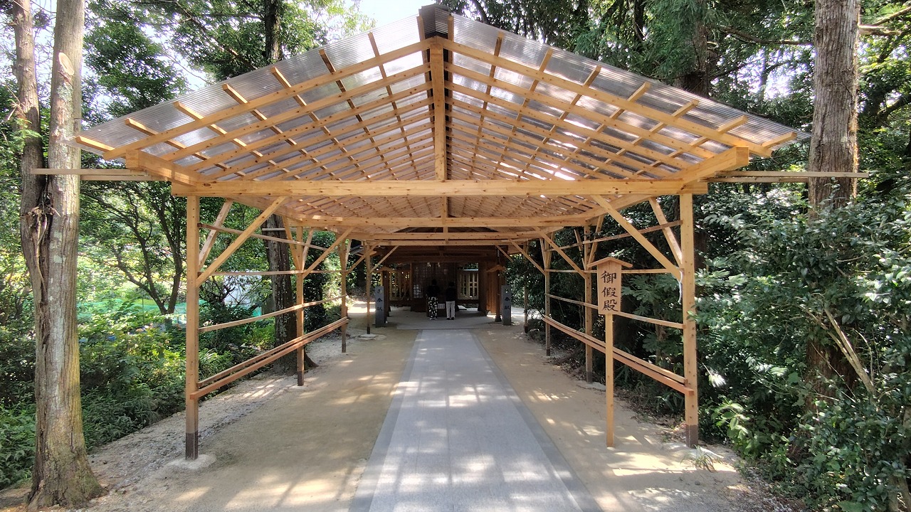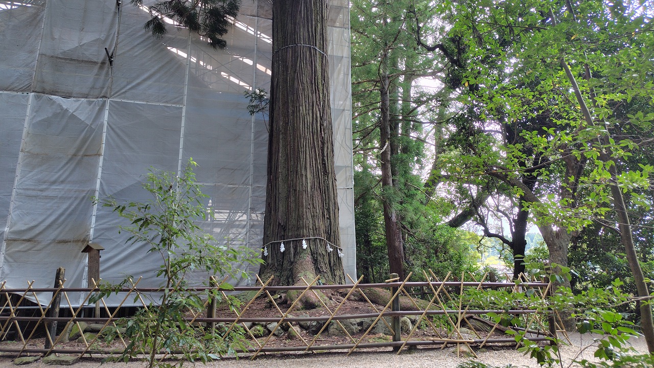1861年(文久元年)建築の本殿(県指定文化財)は屋根葺き替え工事中でした。令和7年11月までの予定だそうです。