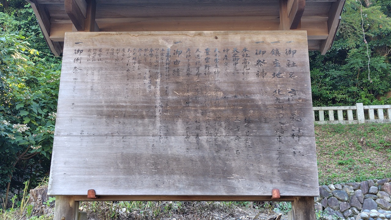 近くにあった由緒書き。文字が薄くて読めませんでした。交換してほしいなぁ