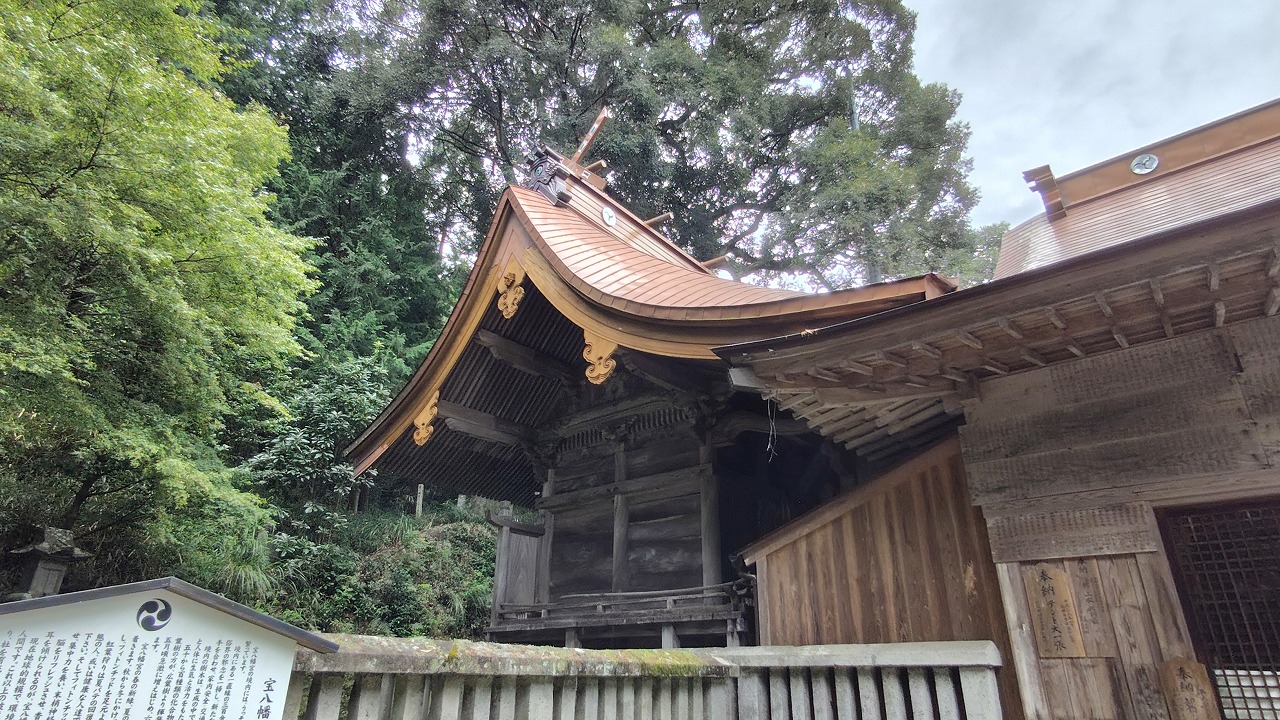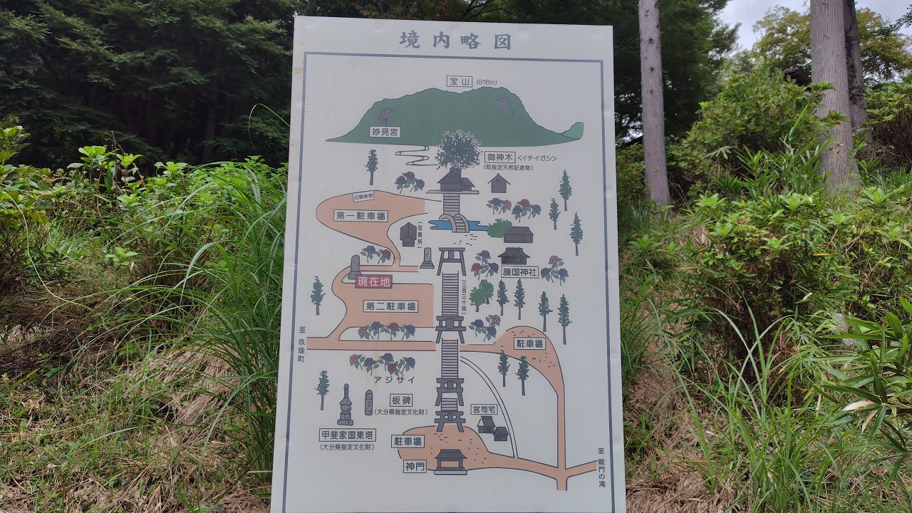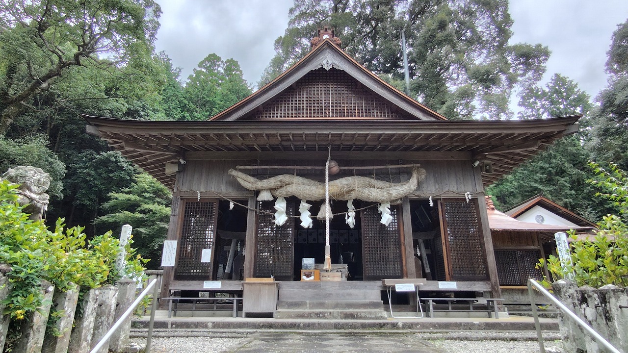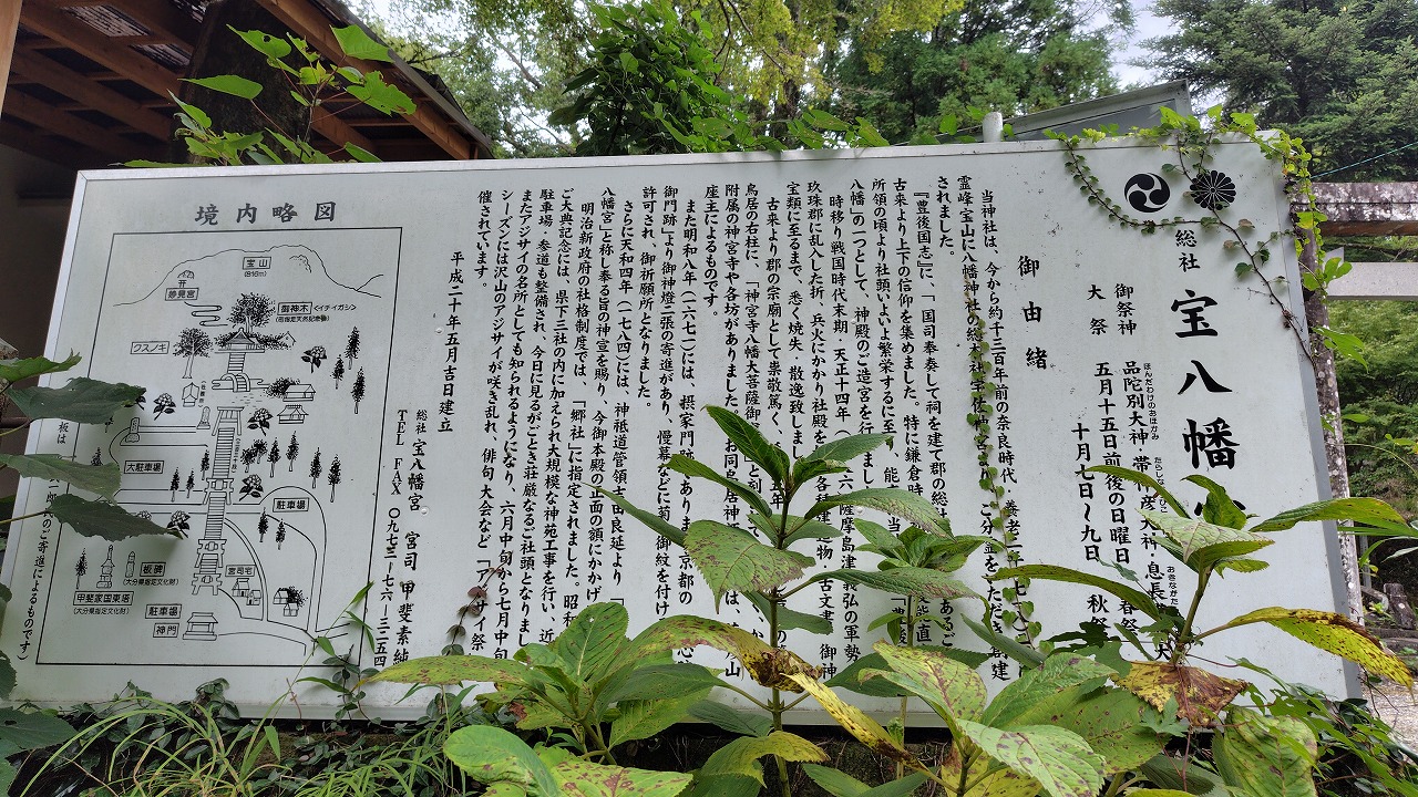 大分県玖珠郡九重町の標高816mの宝山の中腹に鎮座します。 奈良時代に創建された古社で、武運長久や厄除け、家内安全、五穀豊穣に御利益があるとして知られています。