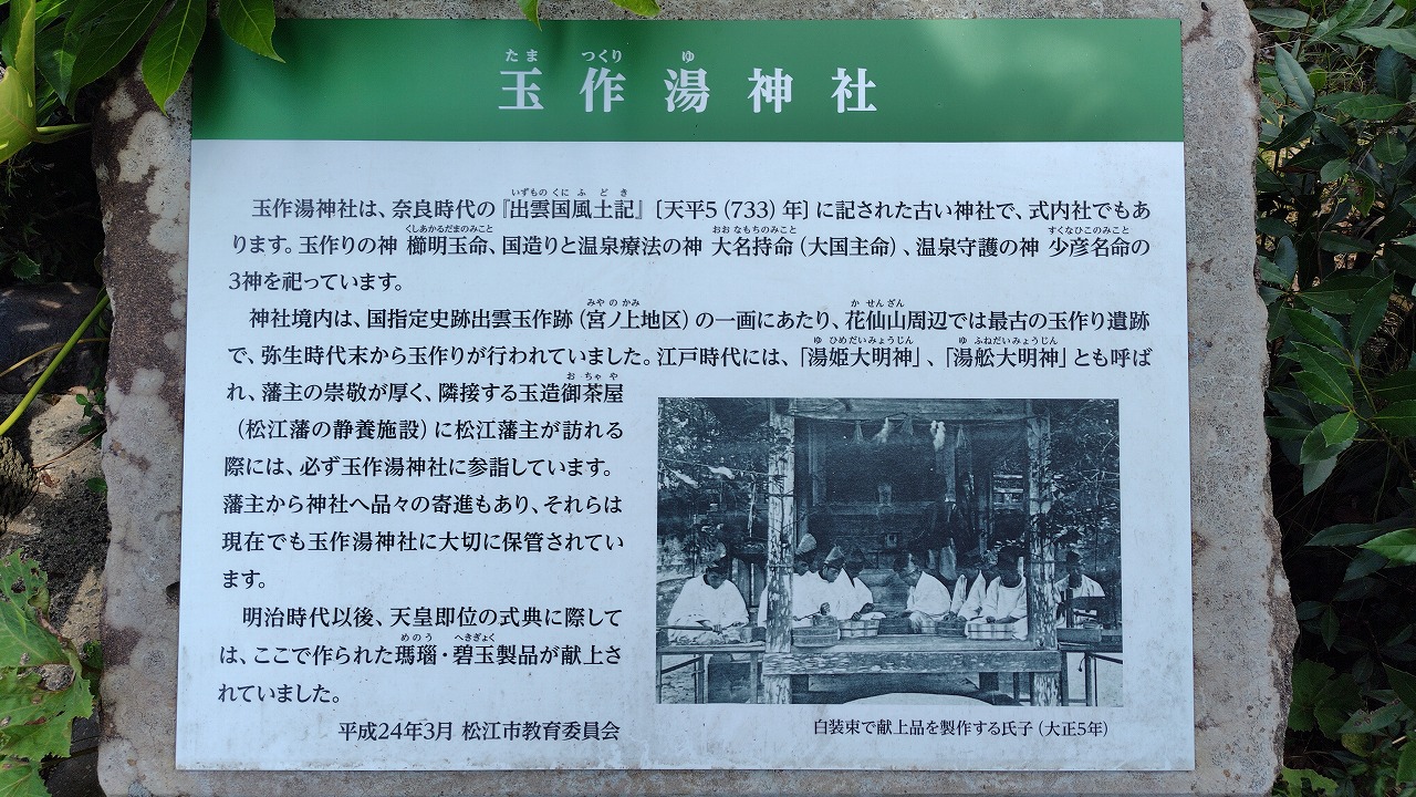 奈良時代の「出雲国風土記」(天平5年(733年))に記された古い神社で式内社でもあります。玉作りの神・櫛明玉命(くしあかるだまのみこと)、国造りと温泉療法の神・大名持命(おおなもちのみこと)、温泉守護の神・少彦名命(すくなひこなのみこと)の3神が祀られています。神社境内は国指定史跡出雲玉作跡の一角にあたり、花仙山周辺では最古の玉作り遺跡で弥生時代から玉作りが行われていました。江戸時代には、「湯姫大明神」、「湯舩大明神」とも呼ばれ、藩主の崇敬が厚く、隣接する玉造御茶屋に松江藩主が訪れる際には、必ず玉作湯神社に参詣しています。明治維新後、社号を「玉作湯神社」に戻すとともに近代社格制度では当初村社に列し、昭和3年(1928年)3月に県社に昇格しました。