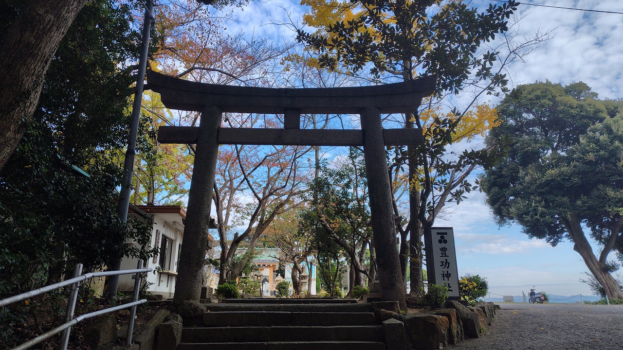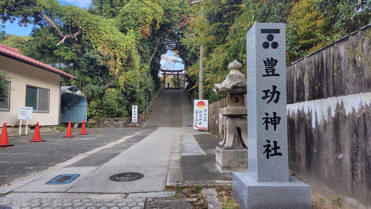豊功(とよこと)神社の社号標。車で通ることができますが、急勾配で車の下を擦るおそれがあるので注意が必要です。