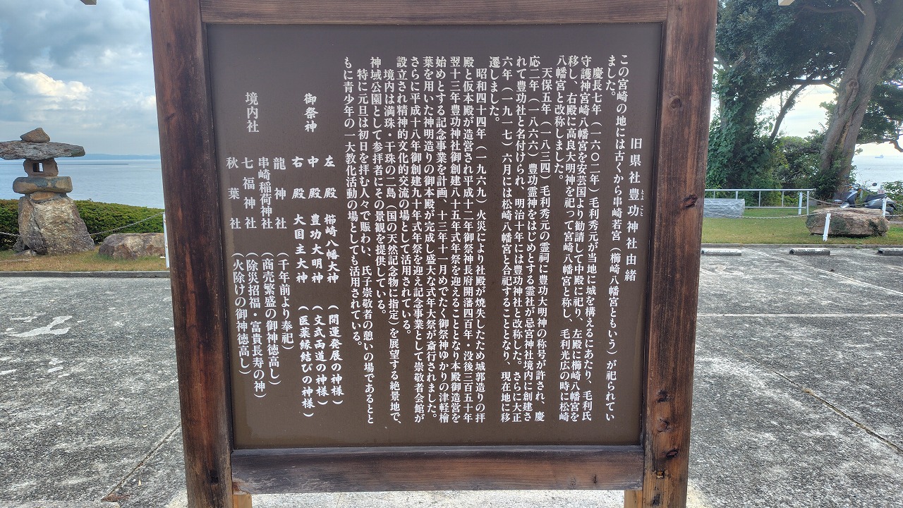 この宮崎の地には古くから串崎若宮(櫛崎八幡宮ともいう)が祀られていました。慶長七年(1602年)毛利秀元が当地に城を構えるにあたり、毛利氏守護神宮崎八幡宮を安芸国より勧請して中殿に祀り、左殿に櫛崎八幡宮を移し、右殿に高良大明神を祀って宮崎八幡宮と称し、毛利光広の時に松崎八幡宮と改称しました。天保五年(1834年)毛利秀元の霊祠に豊功大明神の称号が許され、慶応二年(1866年)豊功霊神をはじめとする零社が忌宮神社境内に創建されて豊功社と名付けられ、明治十年には豊功神社と改称した。さらに大正六年(1917年)六月には松崎八幡宮と合祀することとなり、現在地に移遷しました。
