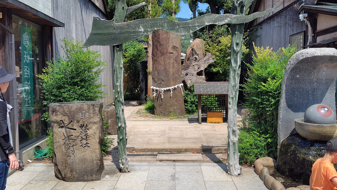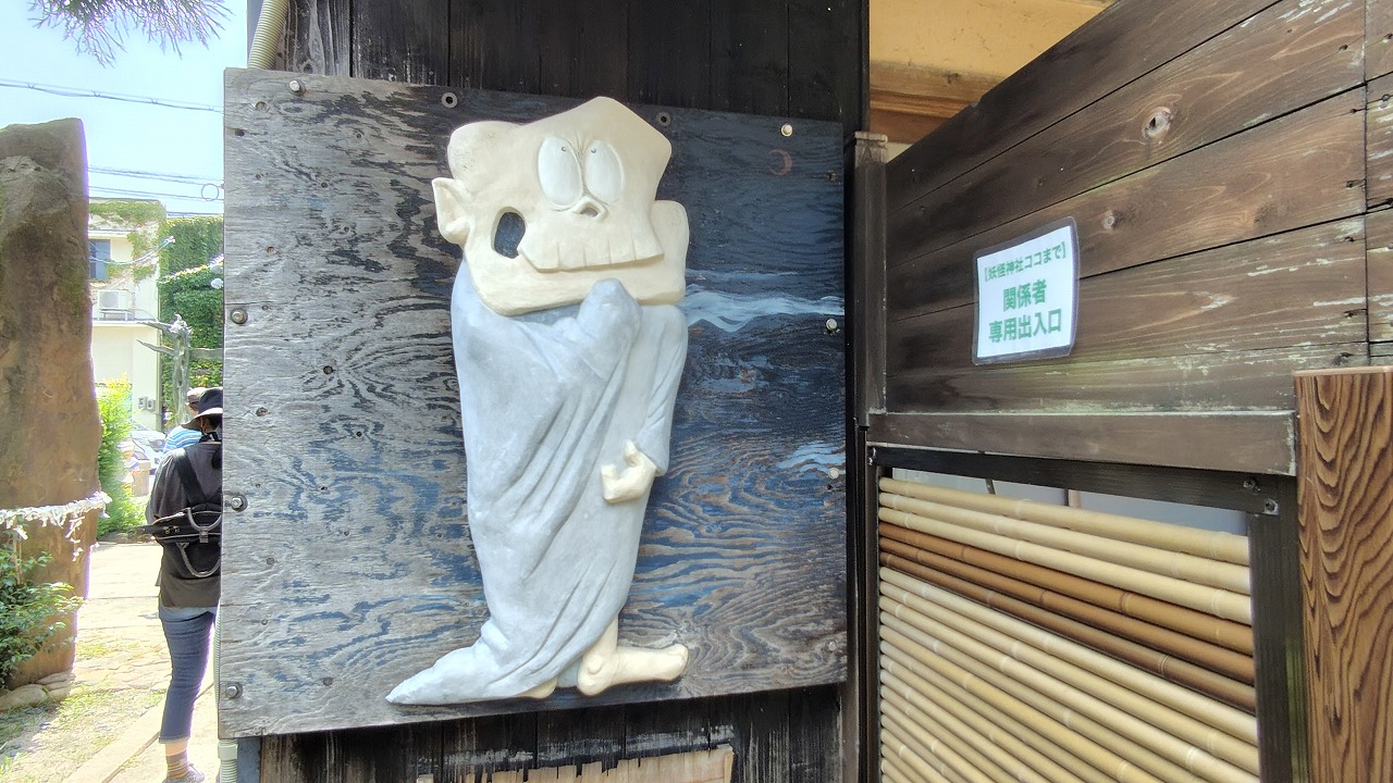 妖怪神社の社号標。一反木綿をデザインとした鳥居から入ります。